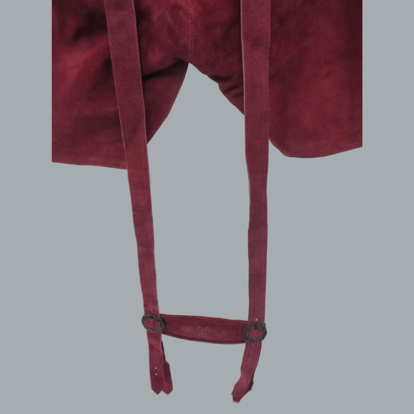New with tags authentic Bavaria Trachten red leather women’s lederhosen, size US 16 (EU 48). Features fine suede leather, traditional embroidery, and adjustable suspenders—perfect for Oktoberfest, festivals, or collectors of German heritage wear.