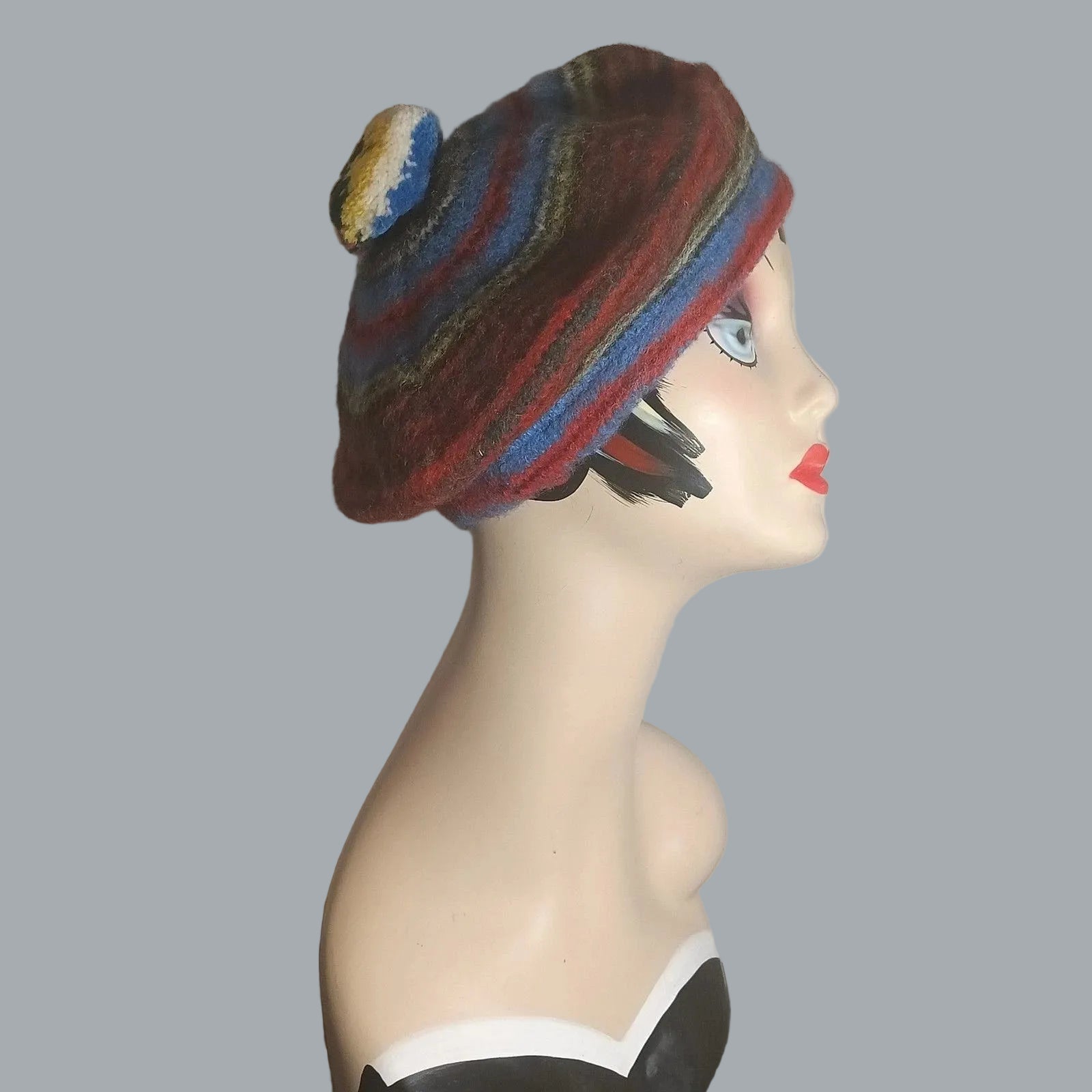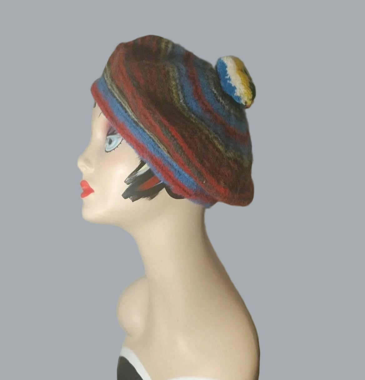 Bold multicolor striping (blue/red/green/yellow tones) + toorie pom
