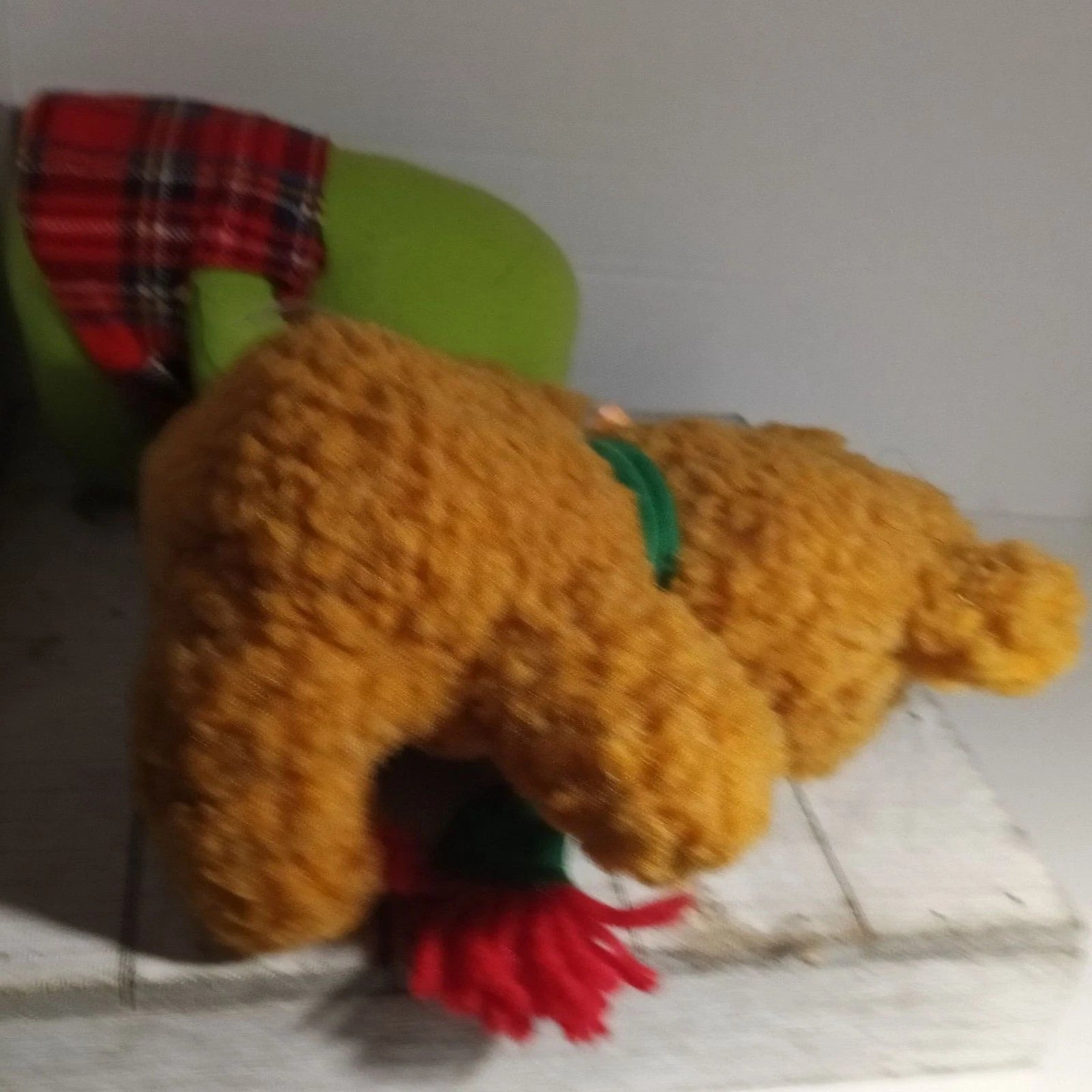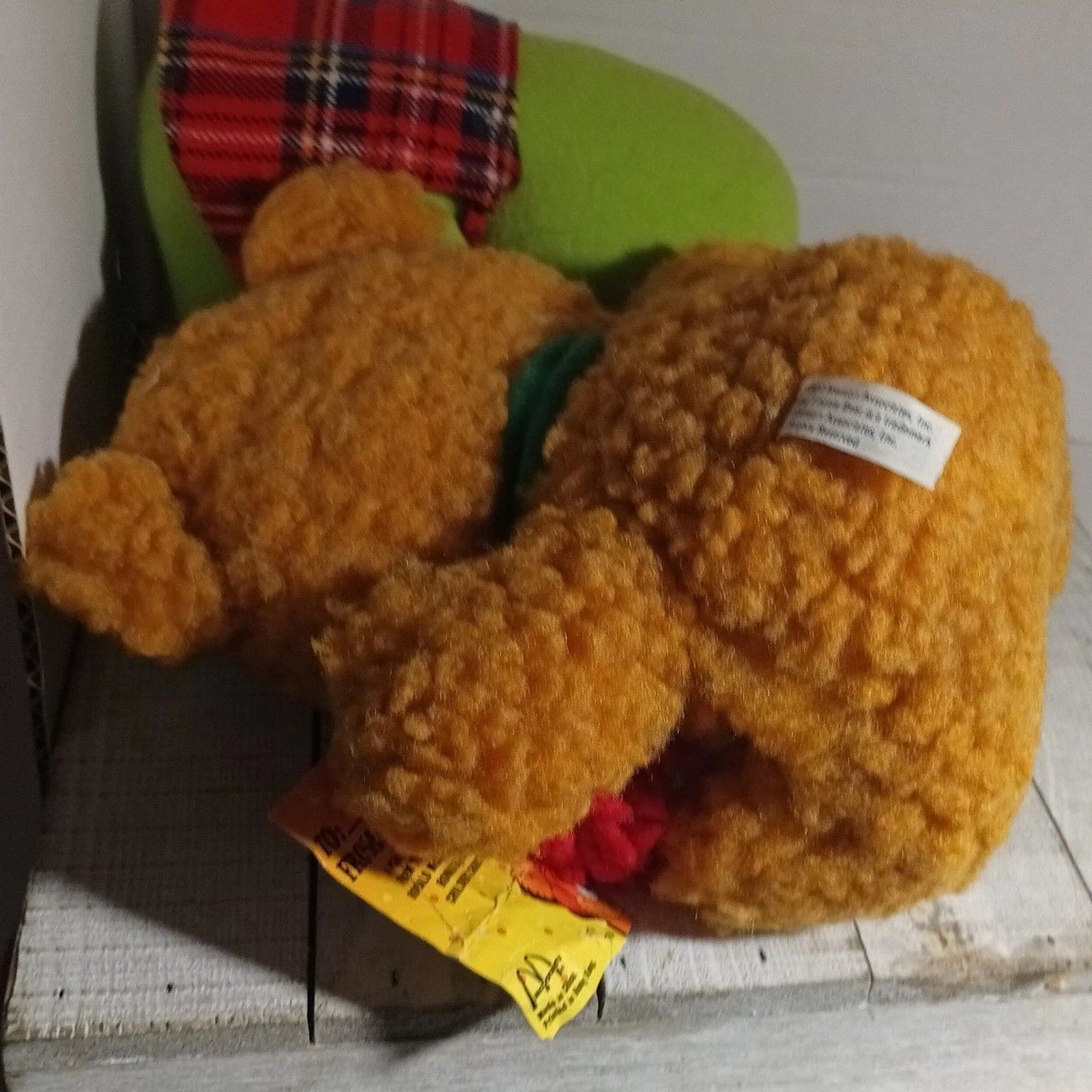 Vintage McDonald’s Muppet Babies plush pair featuring Baby Fozzie Bear in Christmas scarf and Baby Kermit in plaid vest with gift tag. Cute 1980s fast-food premiums for any Muppets fan or holiday display.