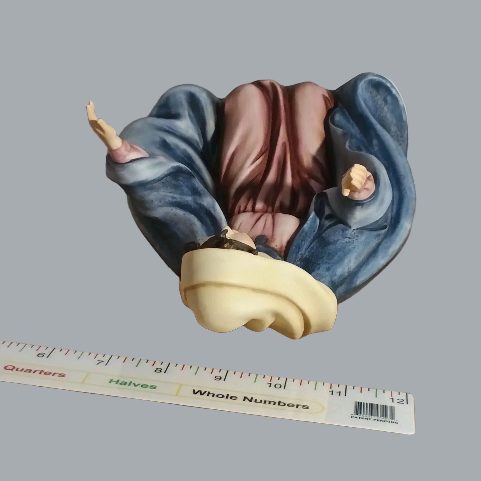 Hand-painted Virgin Mary figurine from the 2002 Grandeur Holy Family Nativity collection. Soft, classic colors (blue mantle, rose gown) and a reverent kneeling pose—great replacement piece or set builder.