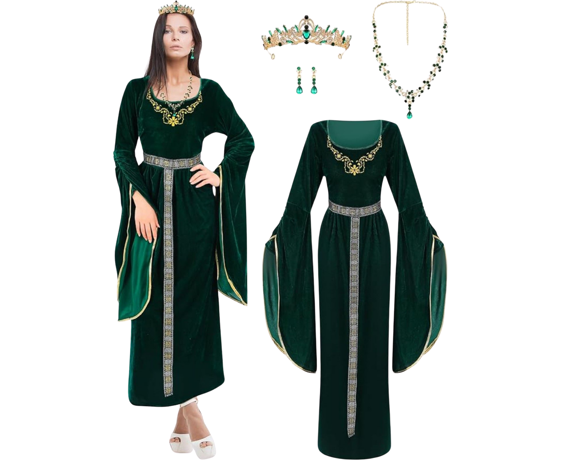 The ensemble includes a stunning crown, a shimmering necklace, and matching earrings, each crafted to catch the light and make you the center of attention. Whether you're channeling your inner princess or attending a medieval-themed celebration, this costume guarantees to leave a lasting impression. Embrace the spirit of adventure and history with this captivating attire, ideal for anyone looking to stand out in style.