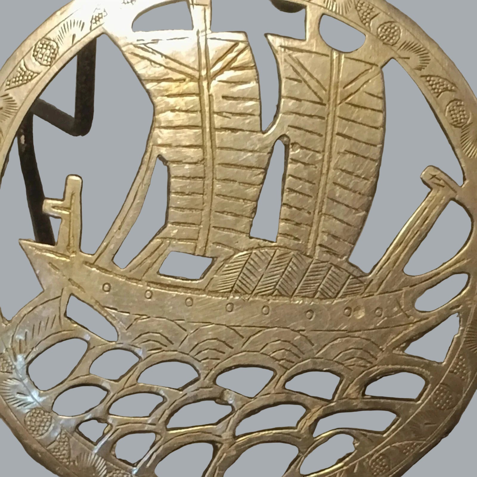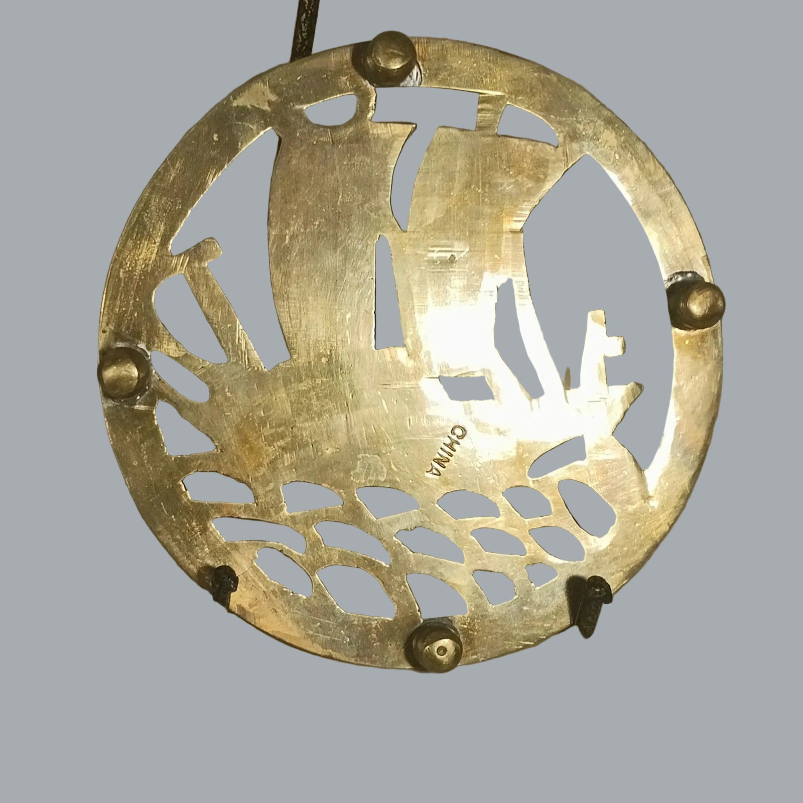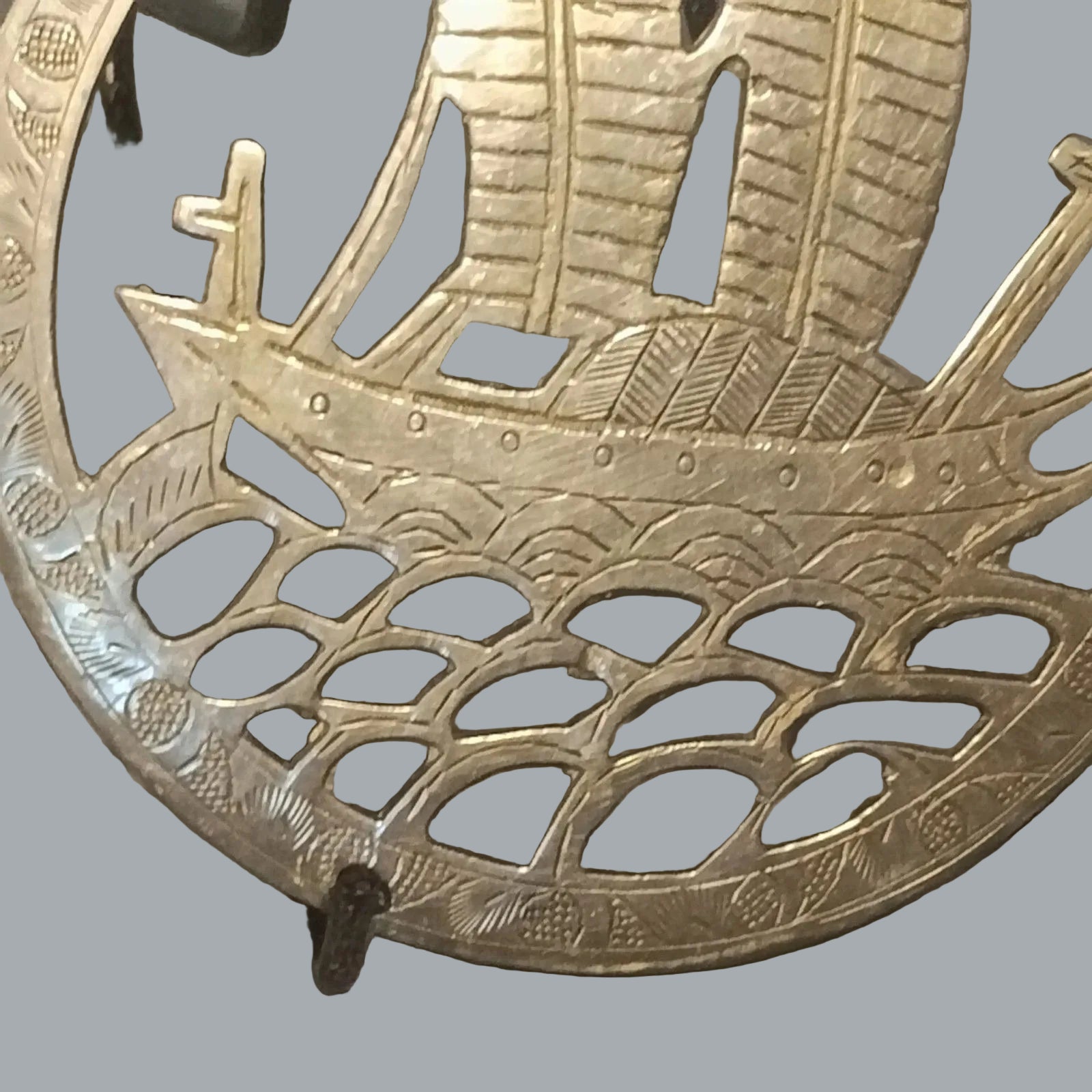 Vintage-style brass trivet / hot plate with cutout sailing ship design and etched border. Marked “CHINA” on back. Approx. 5.25" diameter.