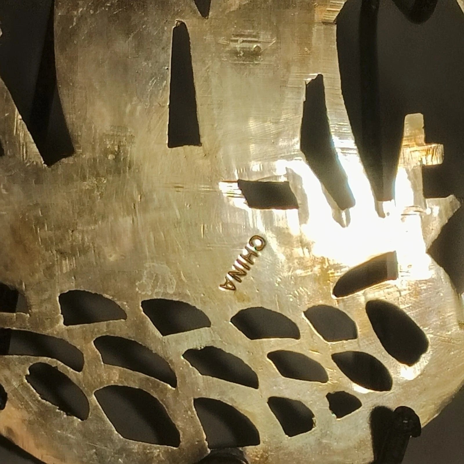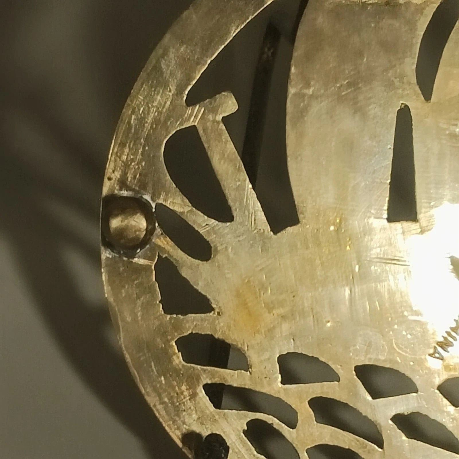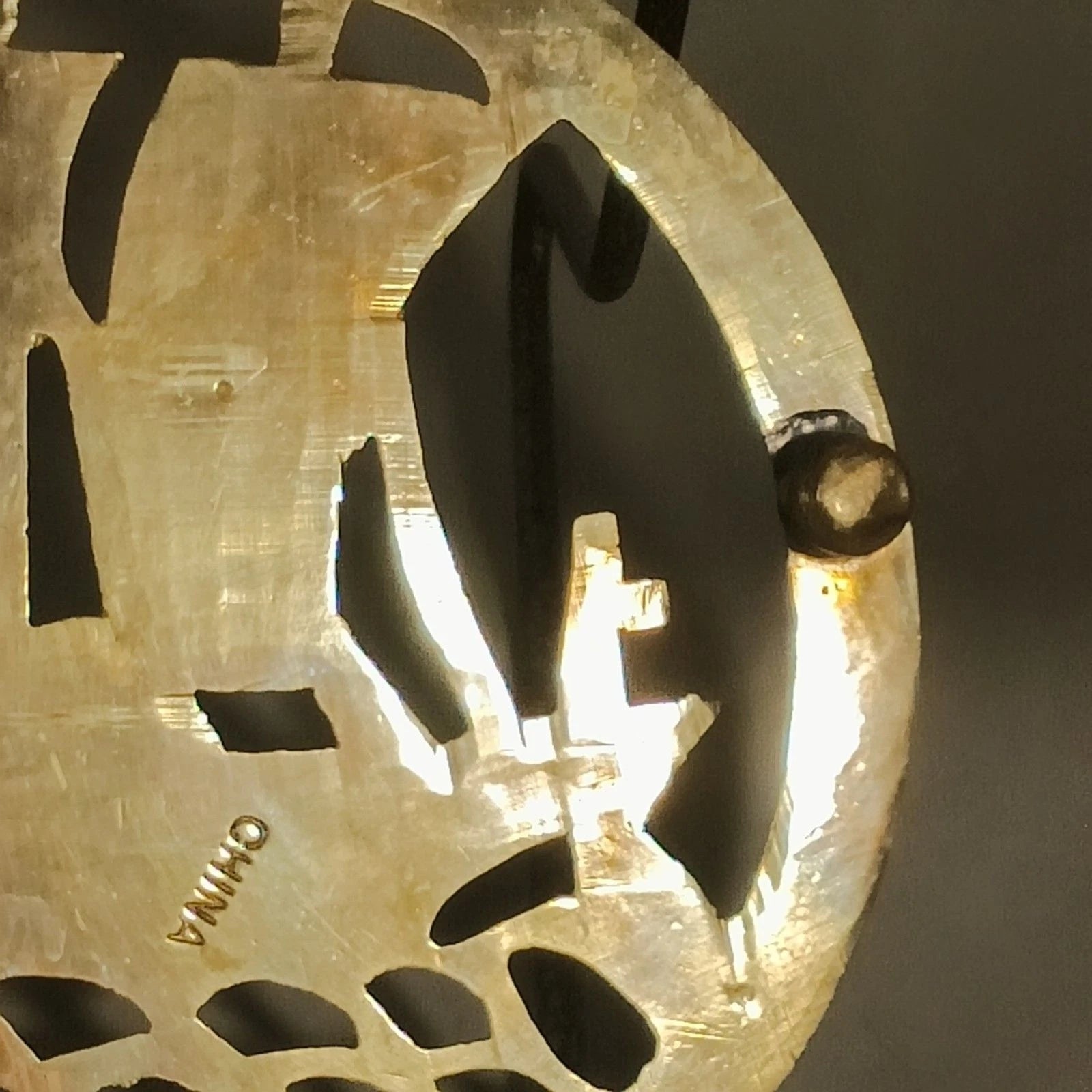 Vintage-style brass trivet / hot plate with cutout sailing ship design and etched border. Marked “CHINA” on back. Approx. 5.25" diameter.