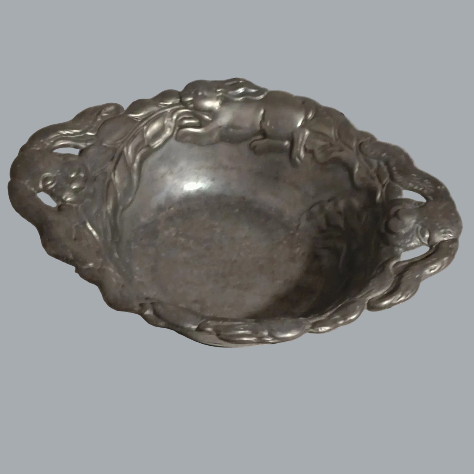 Charming 7" Arthur Court cast aluminum serving bowl with raised bunny rabbits and leafy vines around the rim and handles. Base is clearly marked “Arthur Court © 2001”; original country-of-origin sticker is no longer present. Shows typical surface scratches and wear from use but still displays beautifully.
