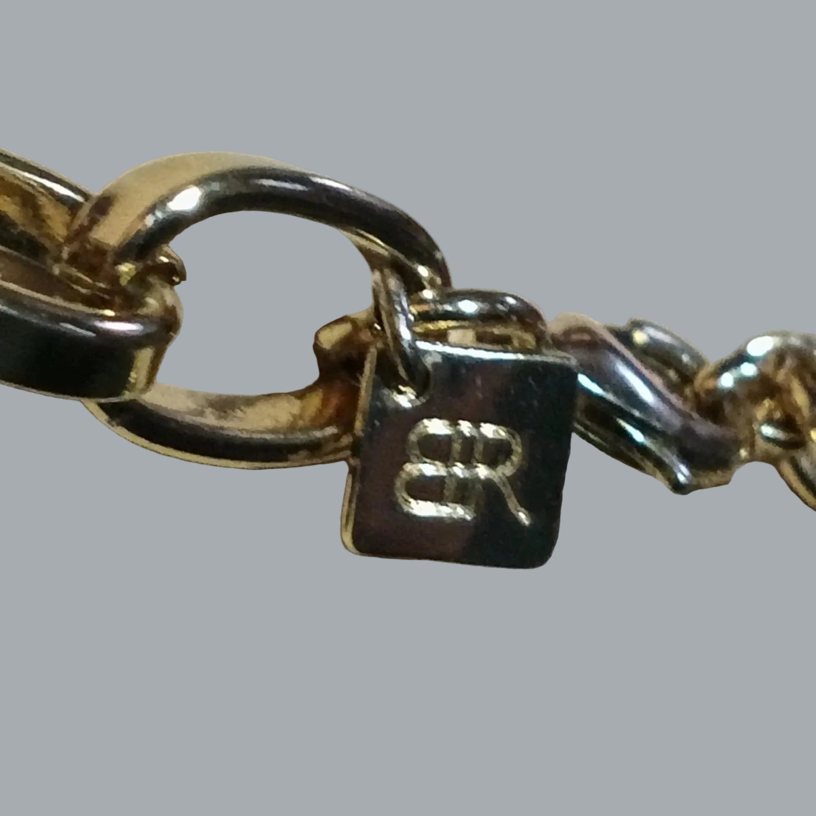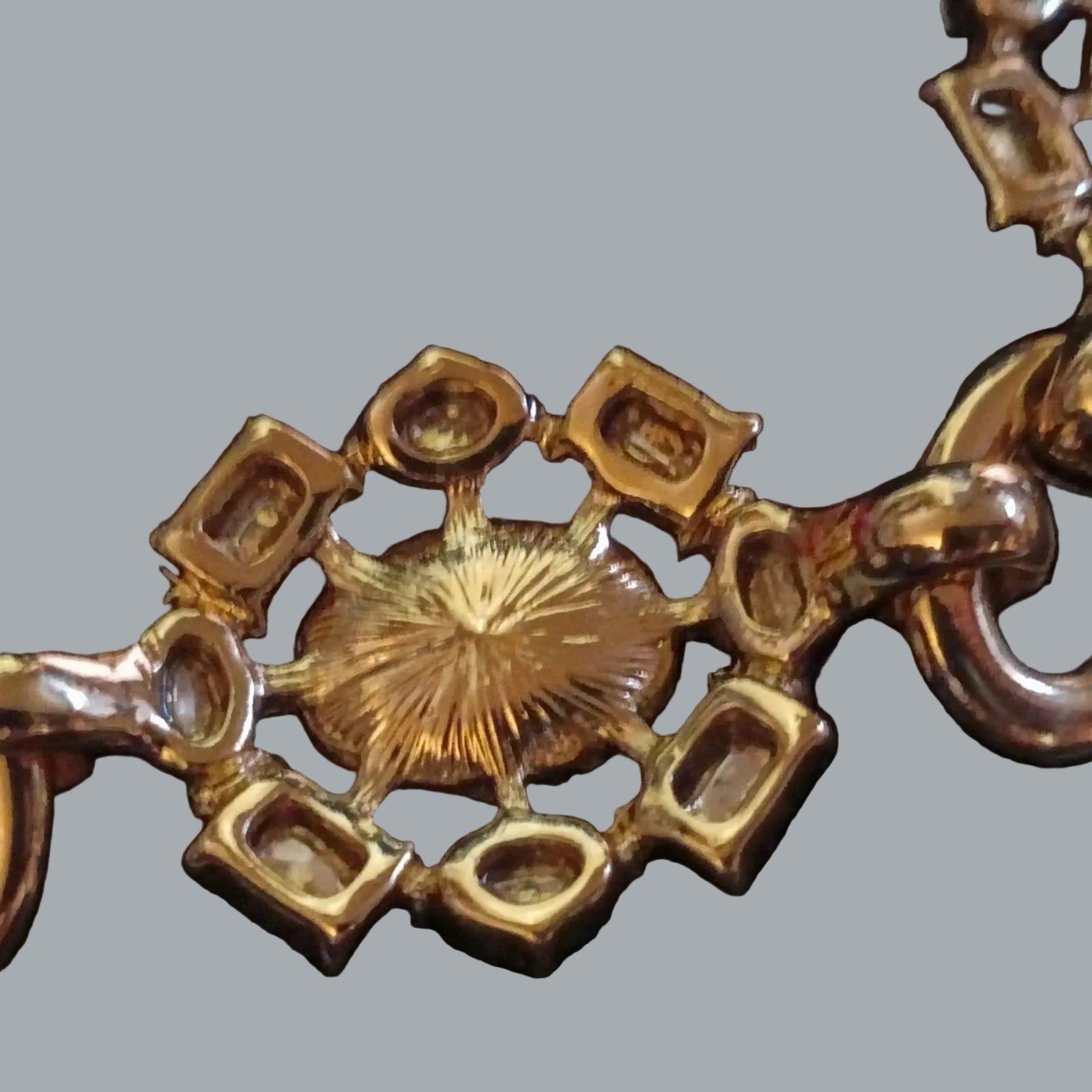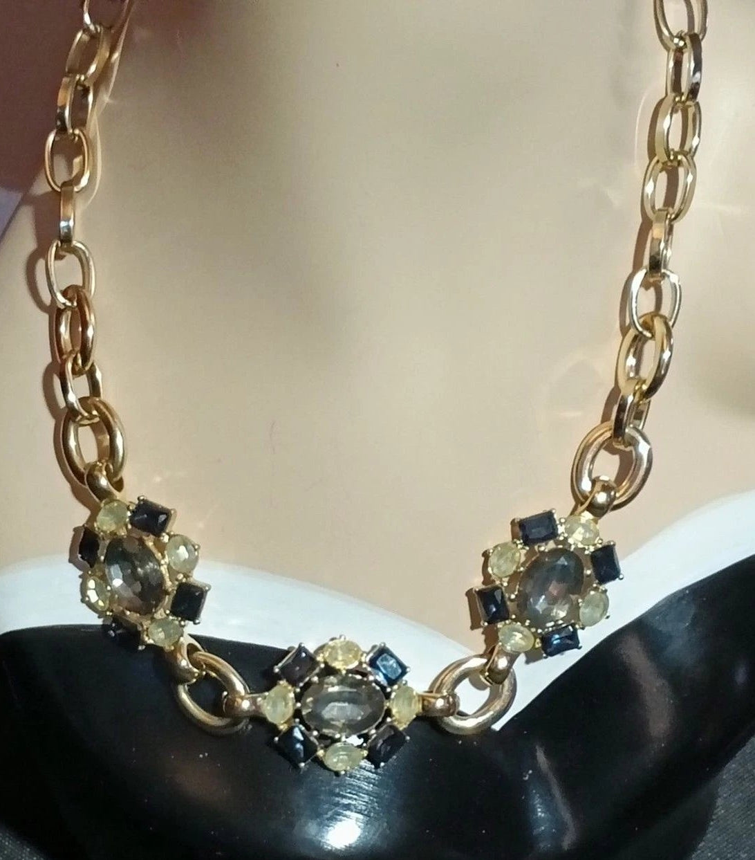 Banana Republic gold-tone statement necklace with smoky oval crystals framed by deep navy and pale yellow glass stones. Chunky link chain with BR logo tag and adjustable length. A chic modern classic that adds polished sparkle to work outfits, date nights, and holiday looks.
