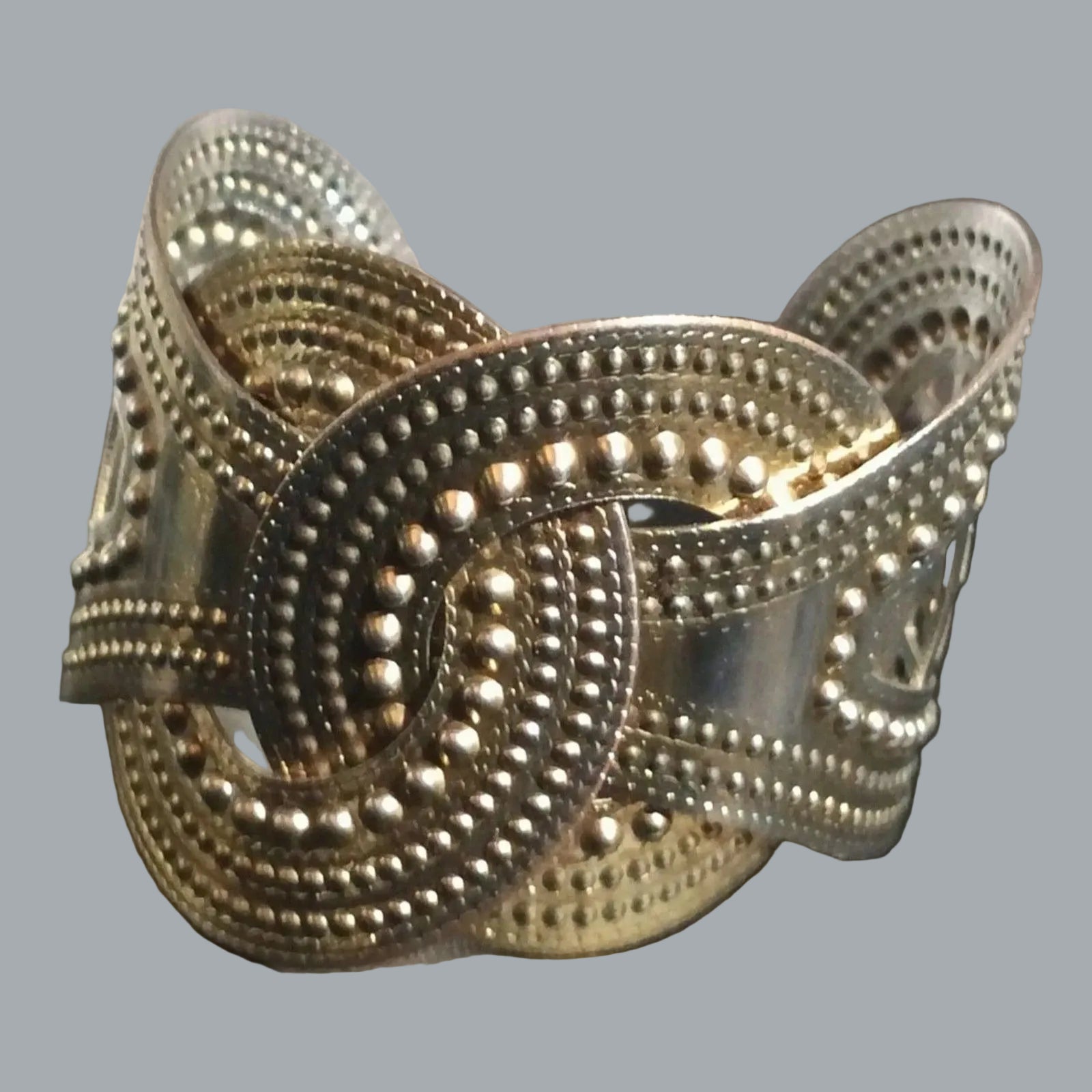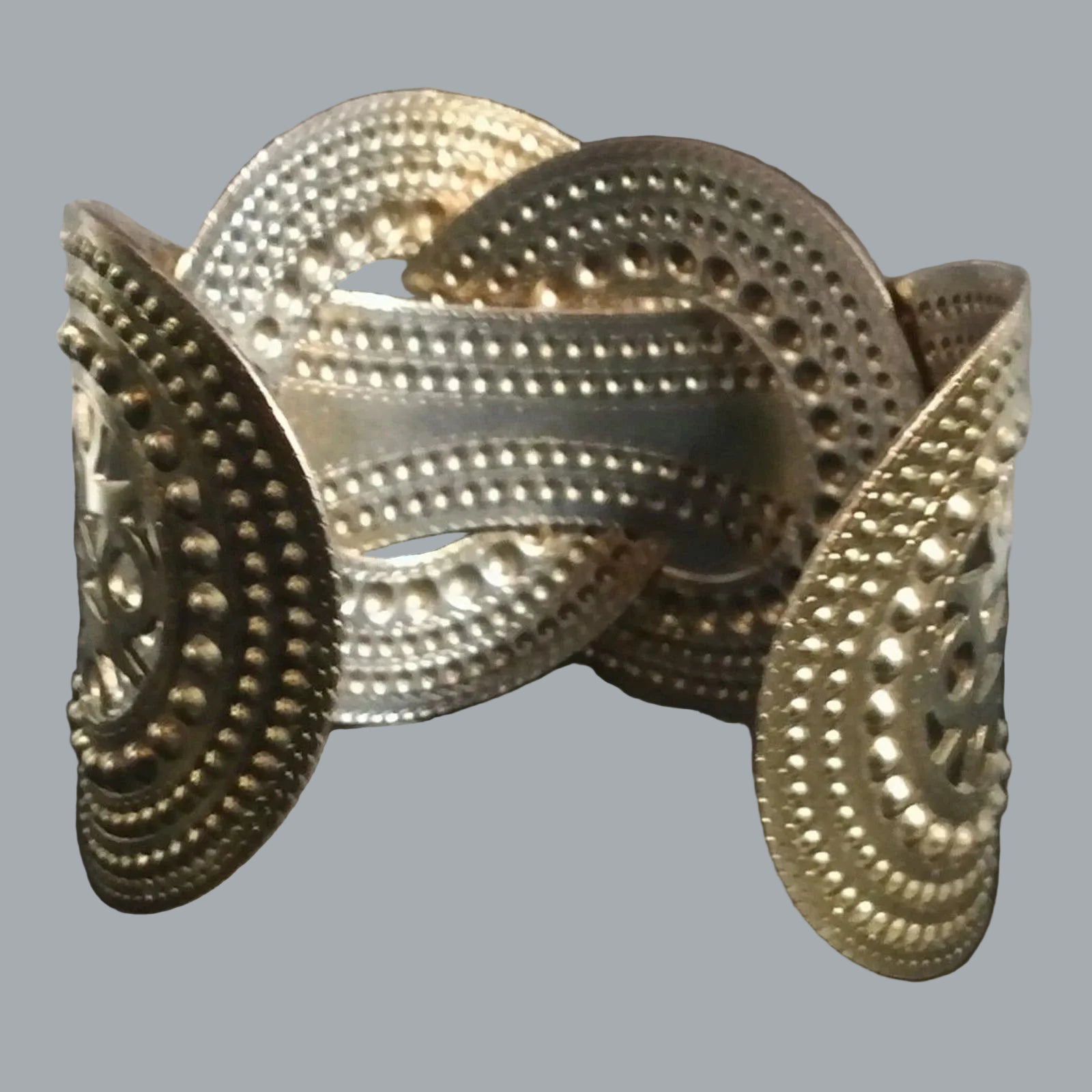 Vintage-style open cuff bracelet featuring intricate filigree and embossed beaded patterns. Gold-tone metal with sculpted layered design. Adjustable fit, lightweight yet bold — perfect for boho, tribal, or statement looks. Excellent pre-owned condition.
