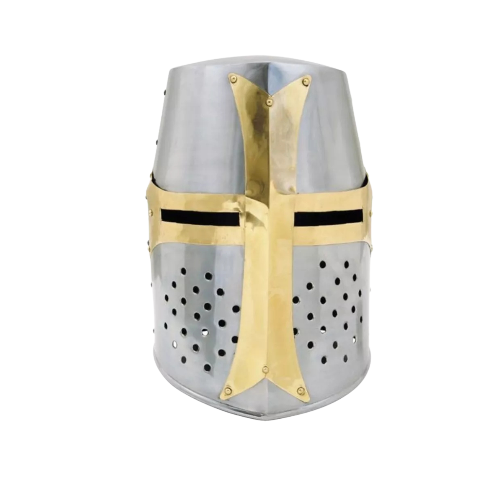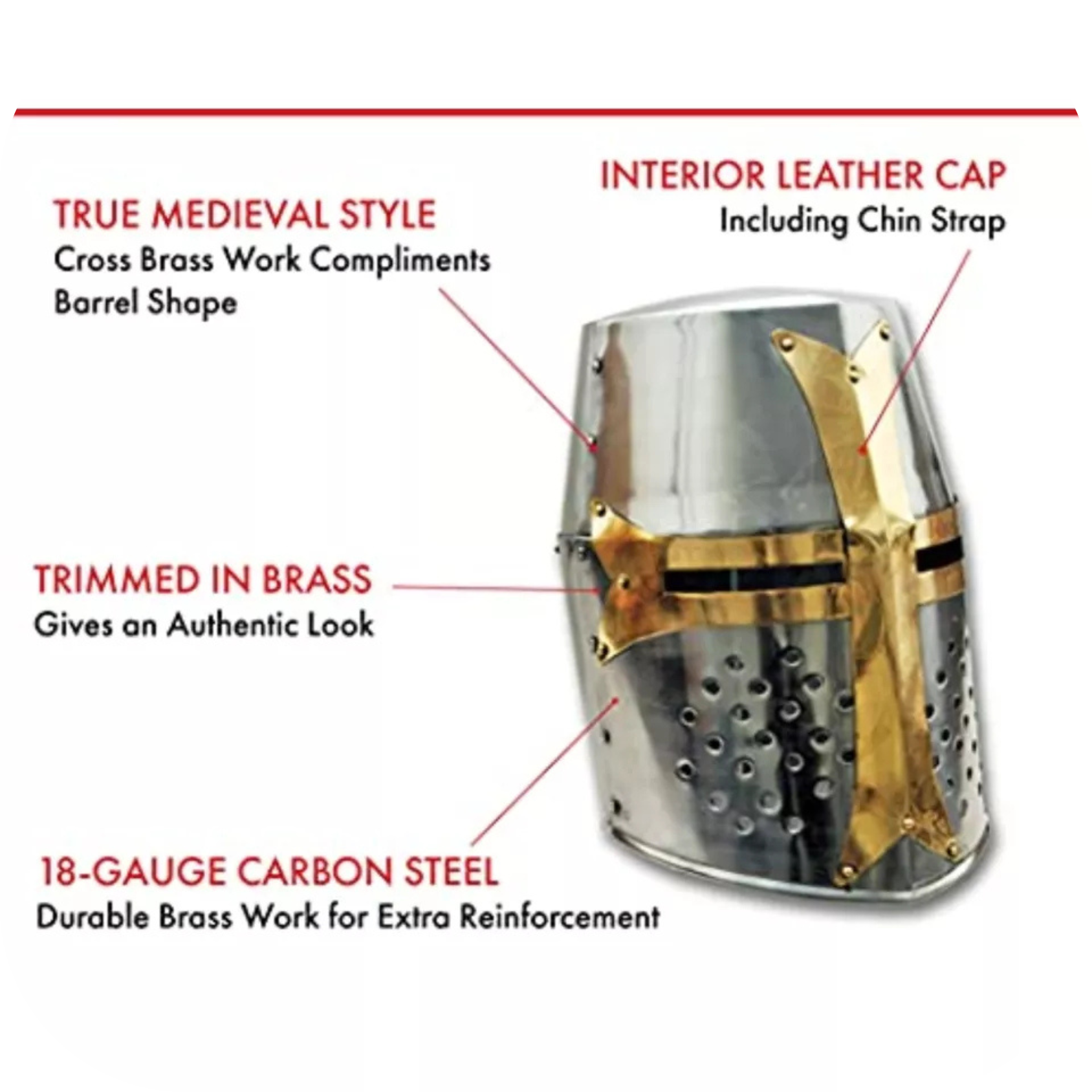 Style : A true medieval helmet replica of its time with the cross-brass work to compliment and the flat top and barrel shape, makes this an authentic look at the middle age's history.