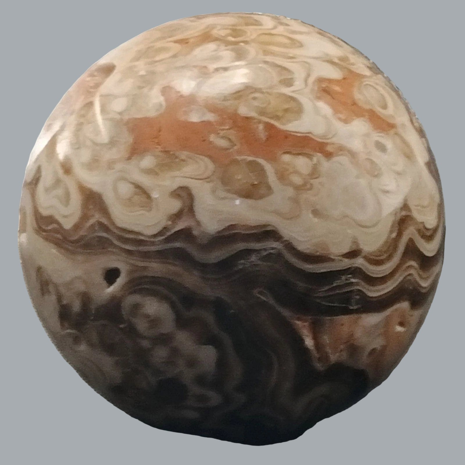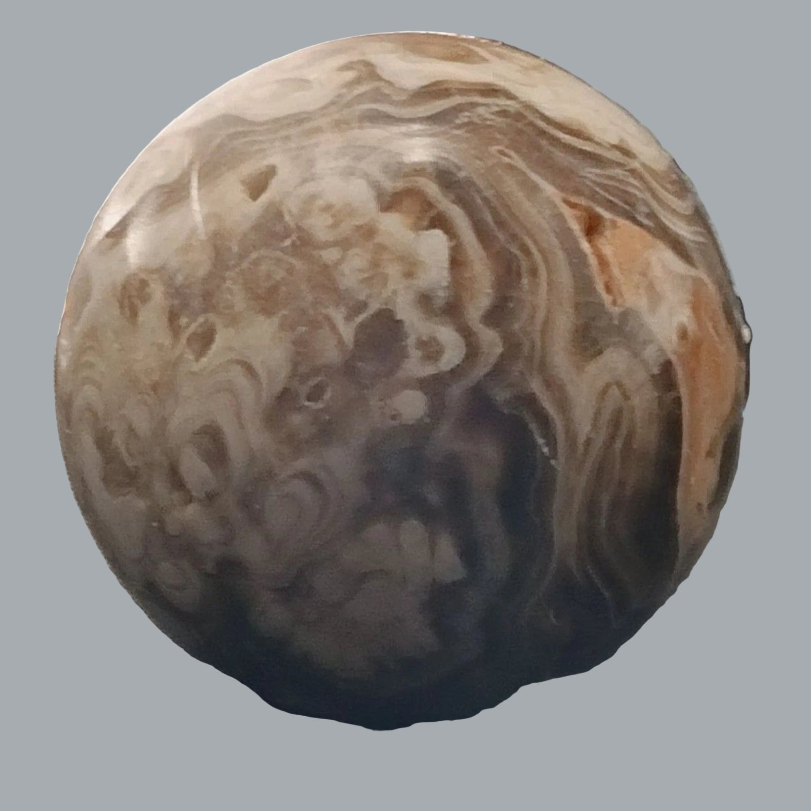 Natural polished orbicular/ocean jasper sphere in cream, tan & brown tones