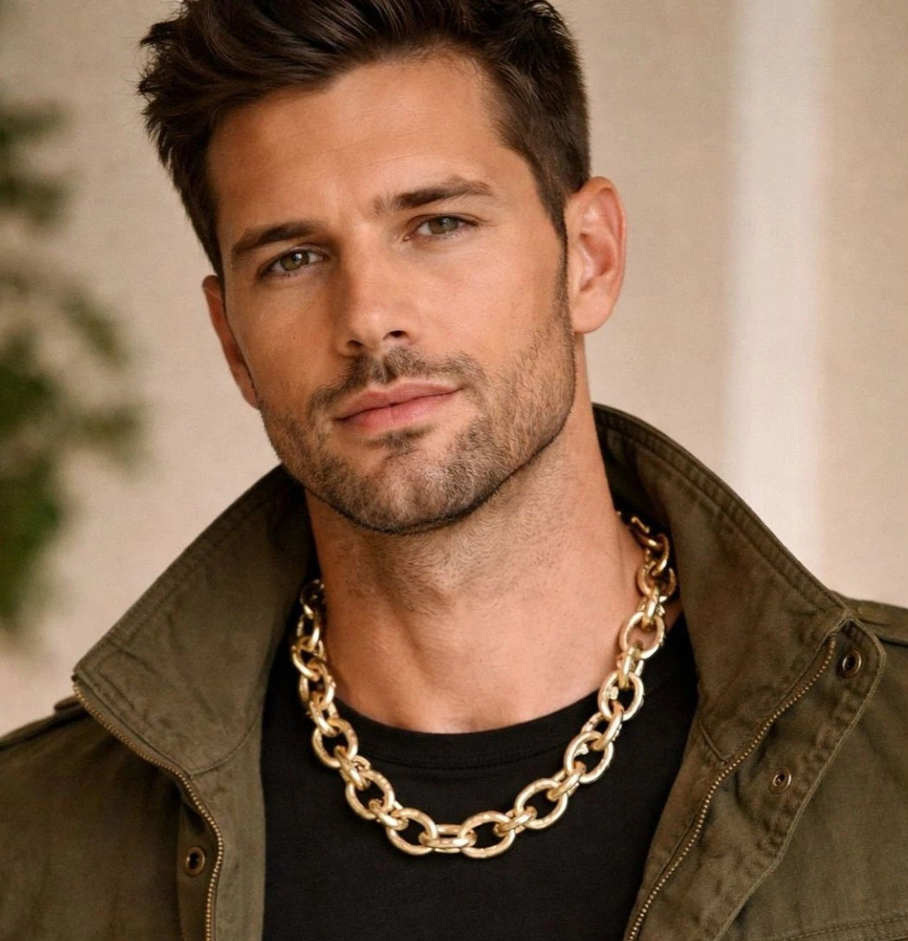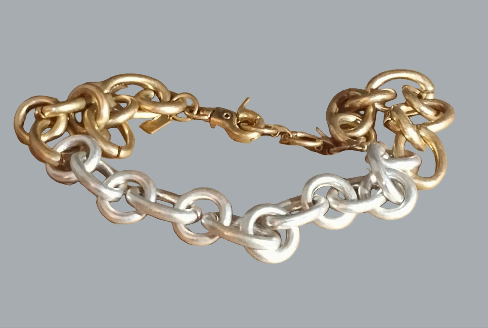 Bold unisex mixed-metal chain necklace with chunky matte links in goldtone and silvertone. A modern statement piece at 20" and a solid 6 oz feel.