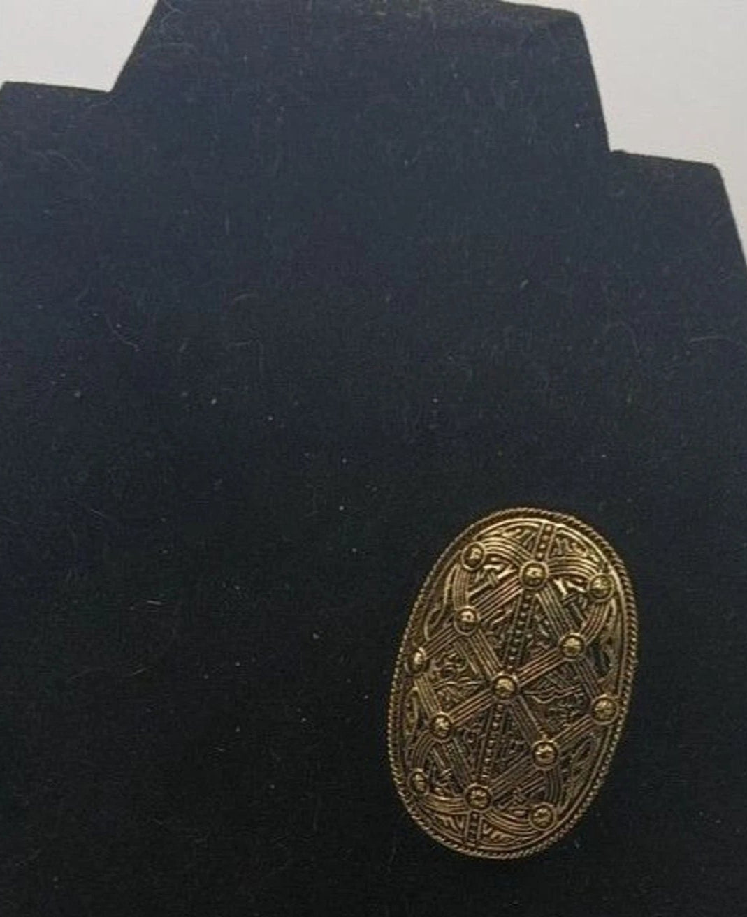 Elegant Celtic Shawl Pin: Secure your style with this 2.5"x1.5" bronze-tone oval brooch, featuring intricate Celtic knotwork design. Perfect for shawls, cloaks, and scarves, adding a touch of ancient elegance and secure fastening. Ideal for historical reenactments, folk costumes, or everyday flair!