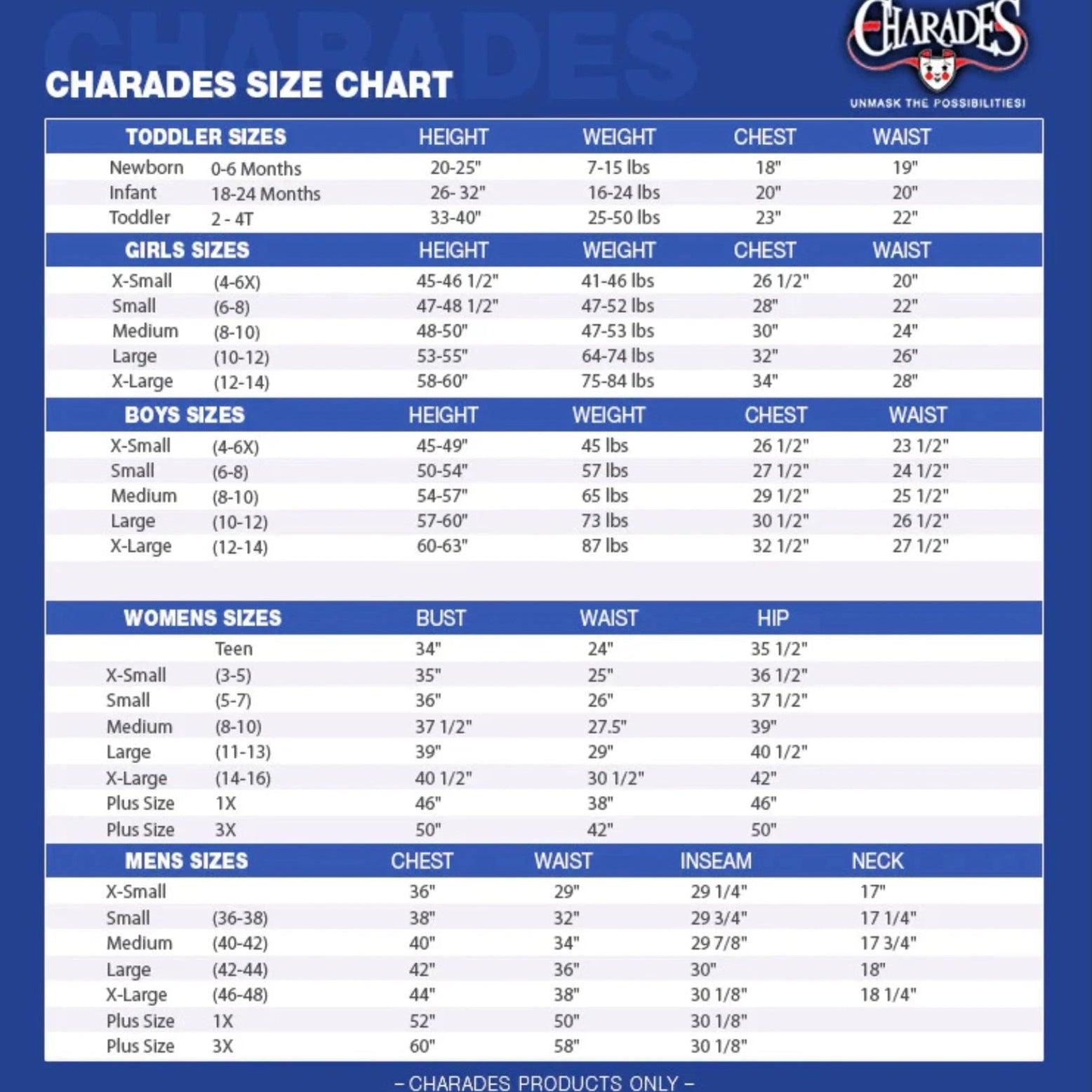 IMPORTANT: Costumes are sized differently than apparel, use the Charades Adult Men size chart in images