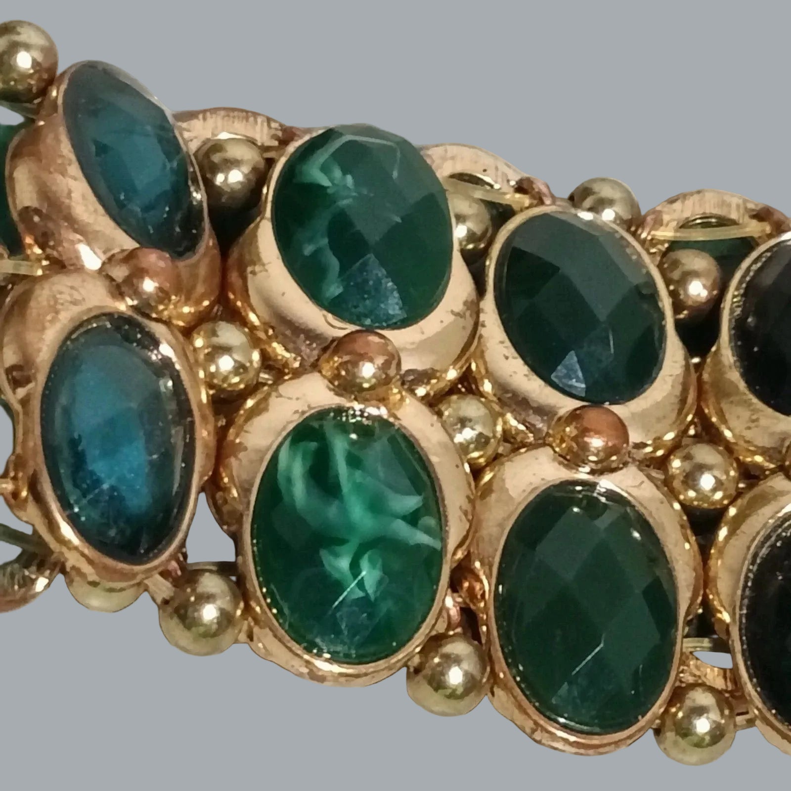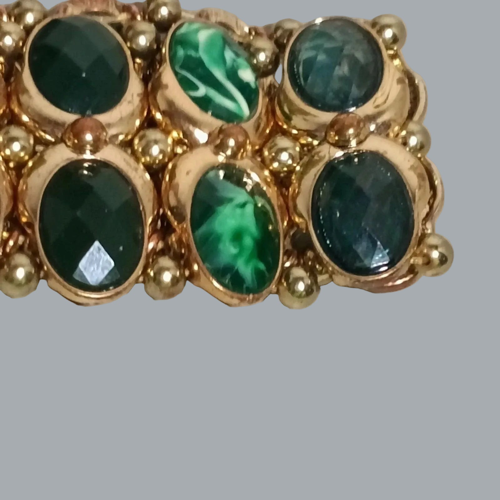 Gold Tone Green Oval Stone Stretch Bracelet 8" x 2" Chunky Statement