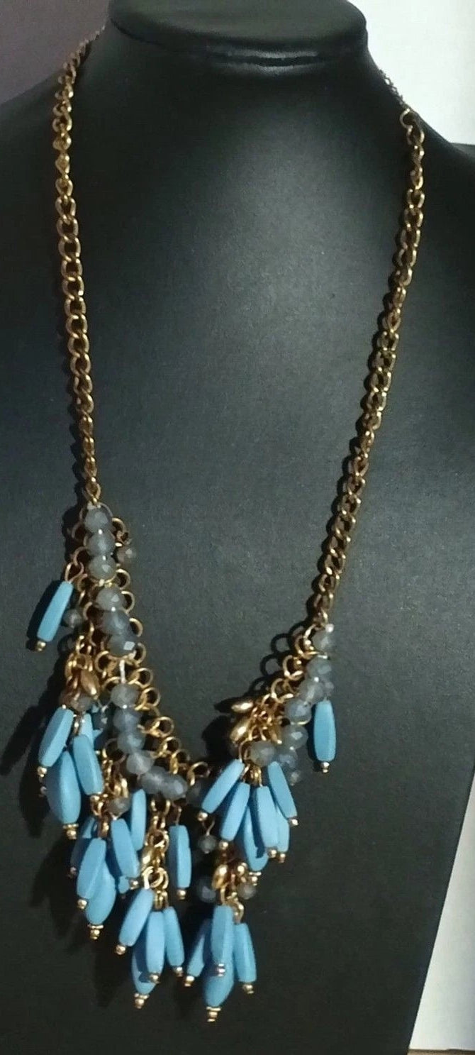 Goldtone Blue Spike Fringe Statement Necklace Gray Faceted Beads