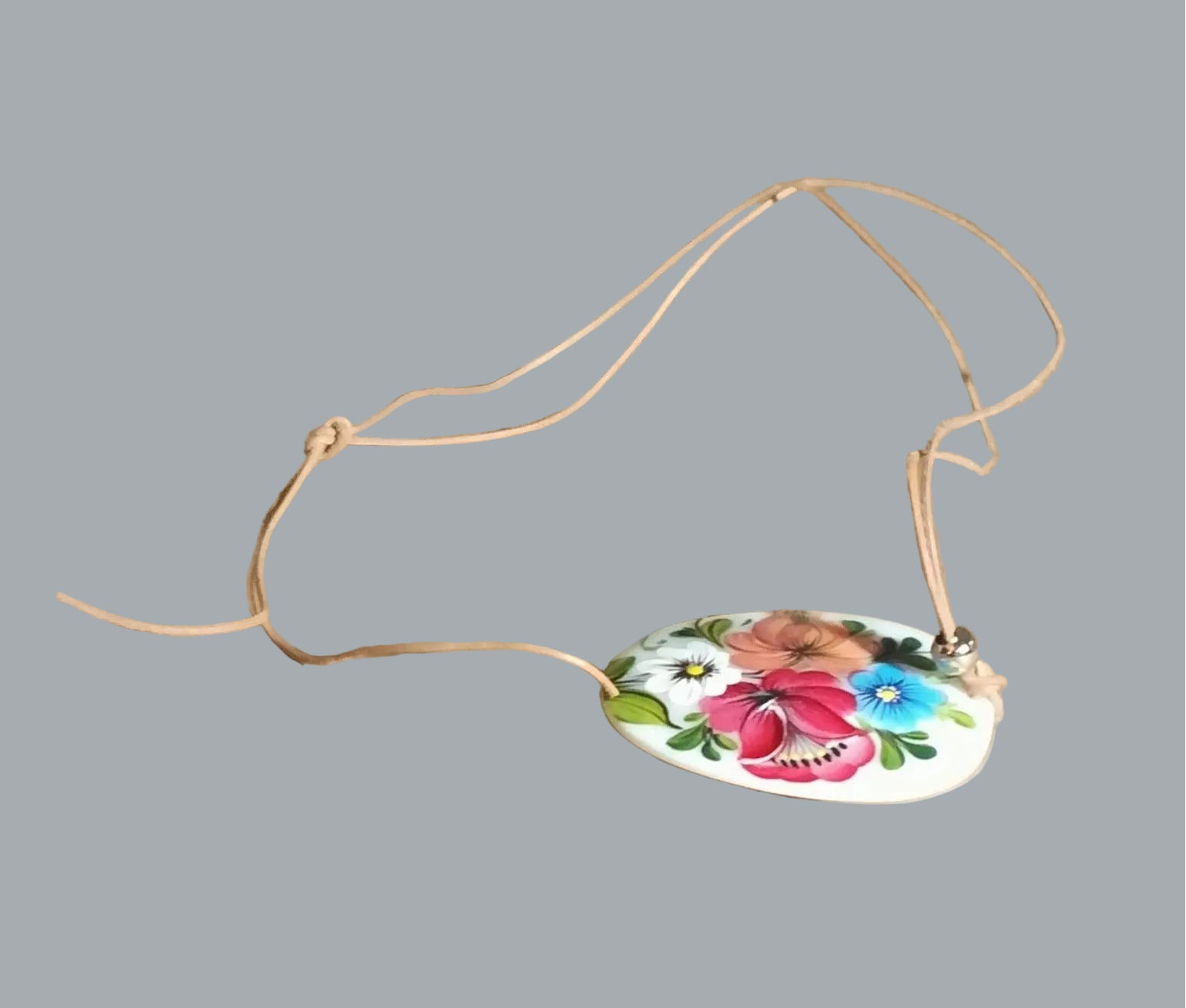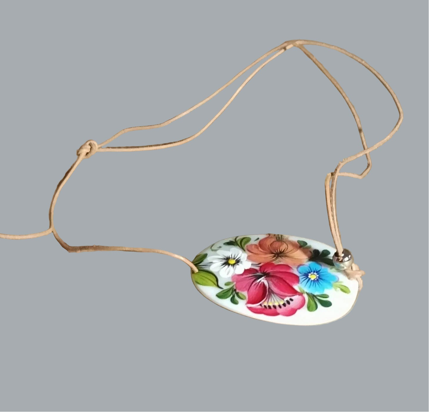 Sweet boho necklace featuring a hand-painted floral design on an oval mother-of-pearl pendant, finished with an adjustable cord tie for easy layering and fit.