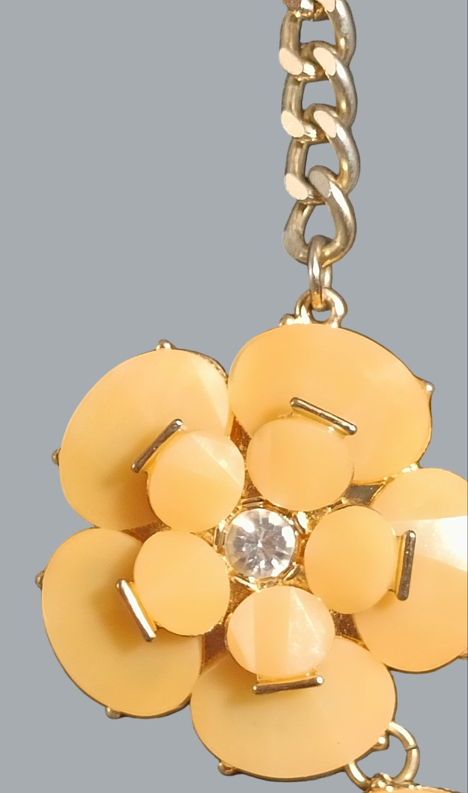 Bold and elegant, this Natasha Floral Statement Necklace features five gold-tone blooms with soft yellow petals and sparkling rhinestone centers. A standout accessory for weddings, brunch, or evening wear—perfect for collectors and fashion-forward stylists.
