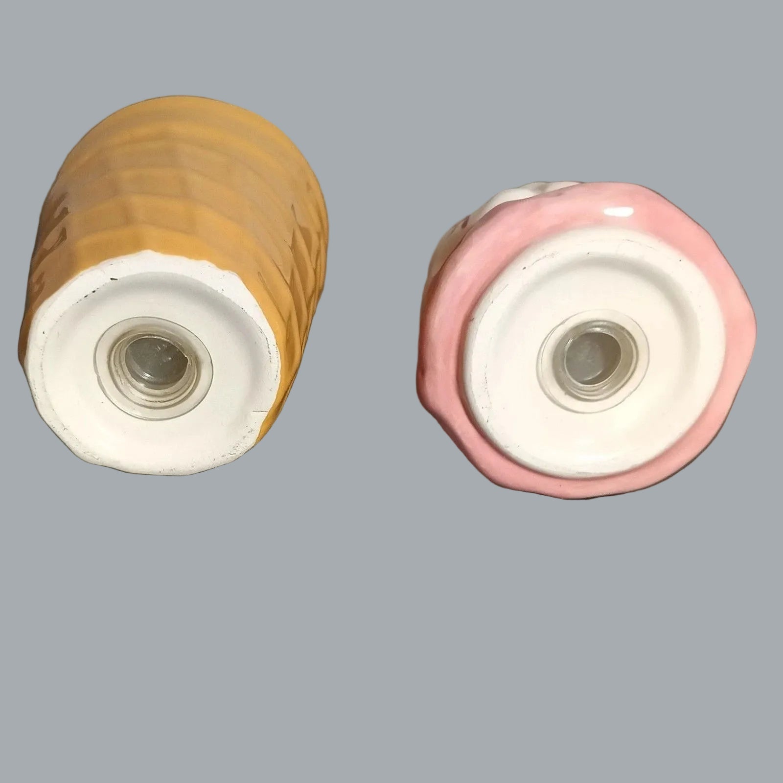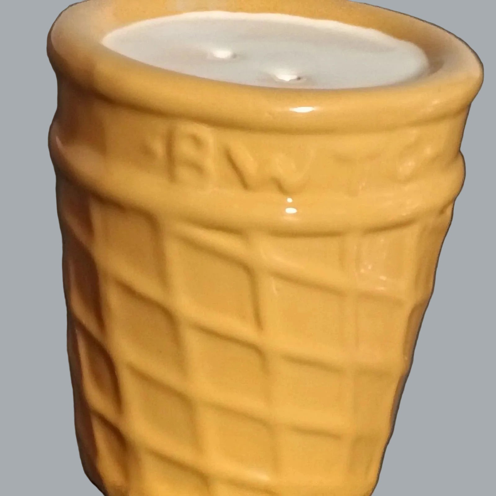 Adorable ice cream cone ceramic salt & pepper shaker set—a waffle cone plus a pink/white “scoop” with sprinkles. Fun retro diner/kitchen décor, and the pieces stack to look like a full cone. Embossed “BWTC” on the cone rim and both appear to have removable clear plastic stoppers on the bottom.