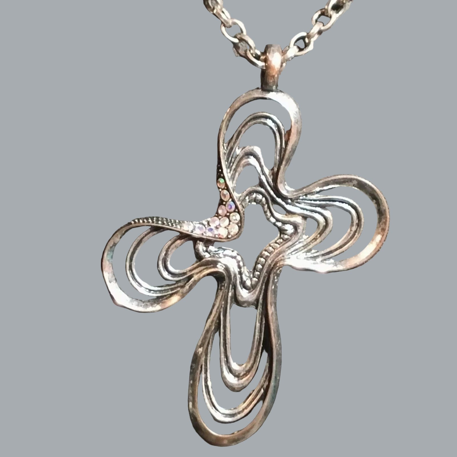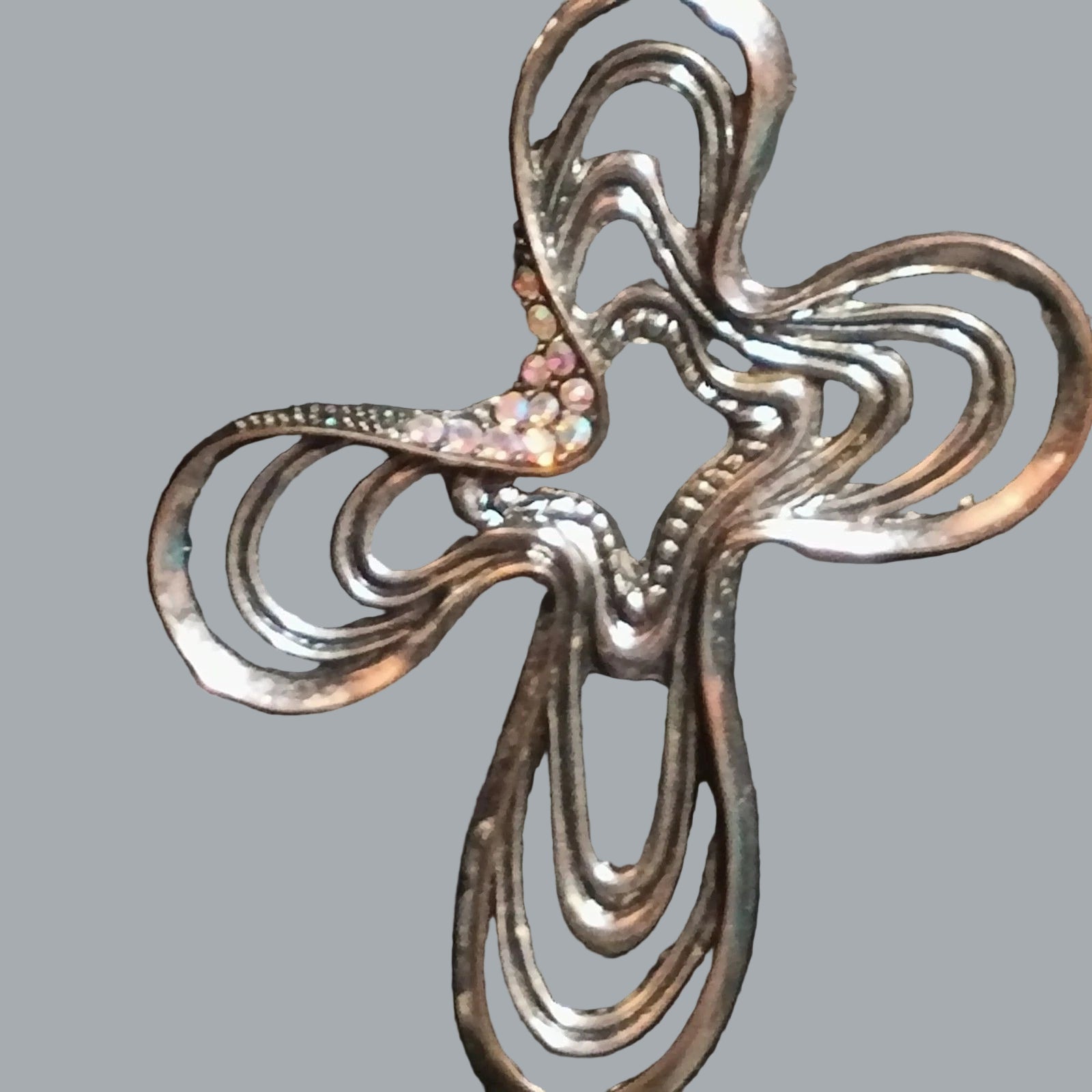 Elegant silver-tone cross pendant with open sculpted design and sparkling aurora borealis crystals. Bold yet graceful statement piece on a sturdy chain. Approx. 20″ long, pendant 2.75″. Excellent pre-owned condition — perfect faith or fashion accessory.