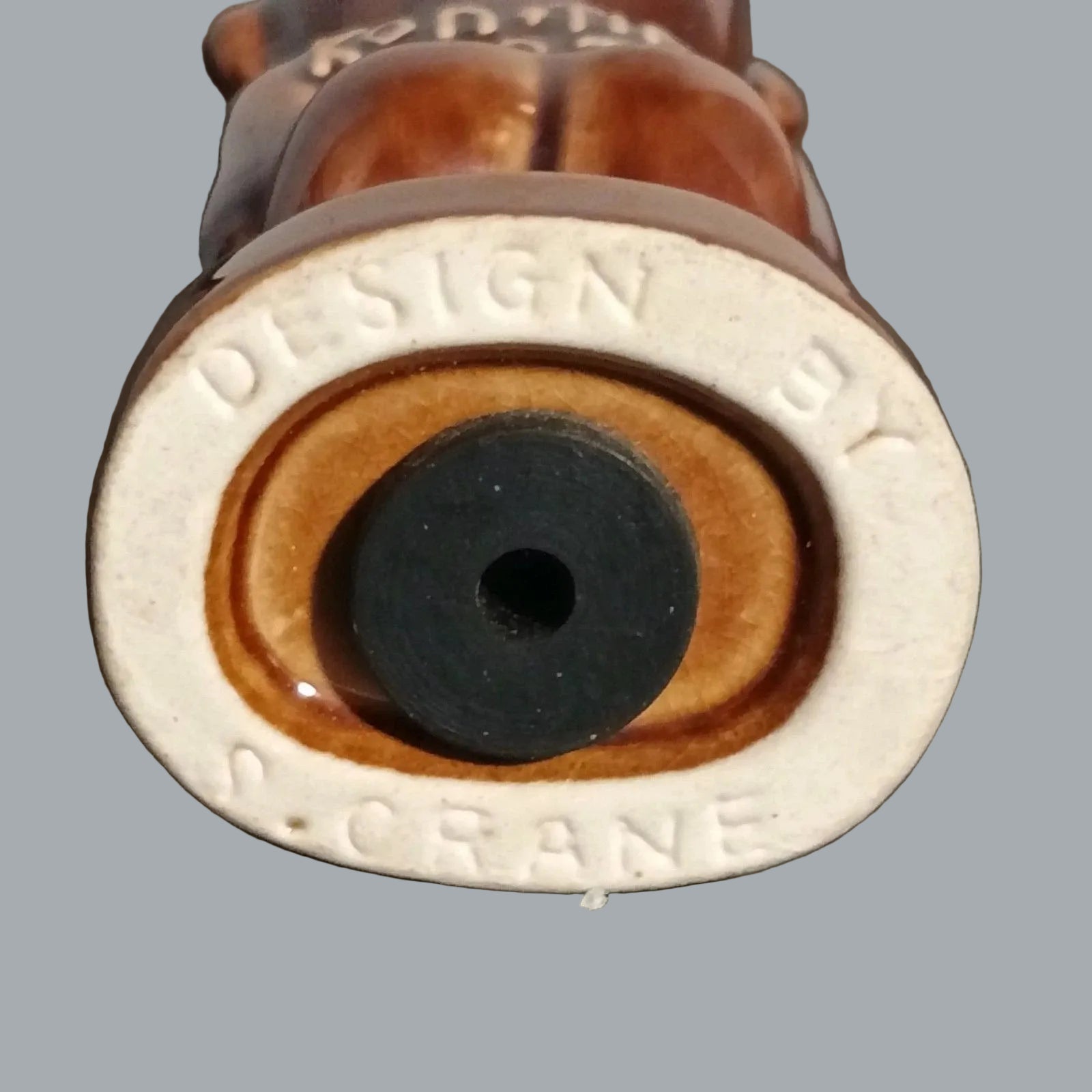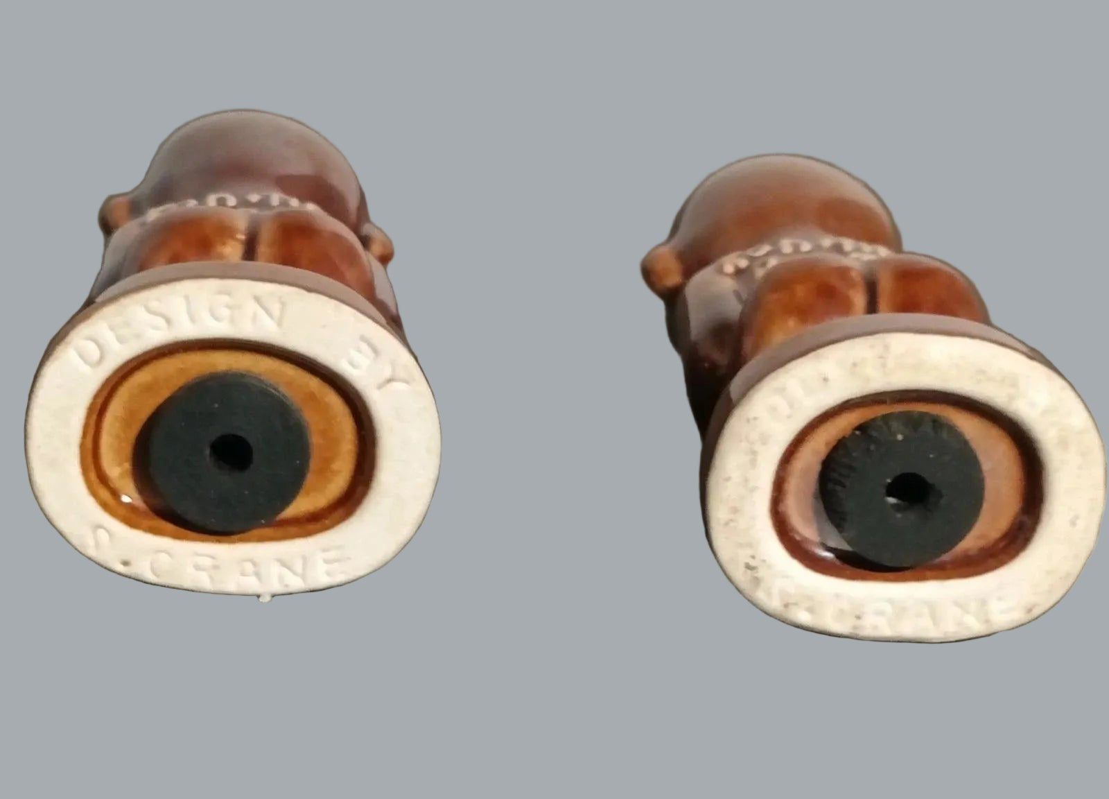 Vintage Koh-Tiki Ports / Kon-Tiki Ports brown ceramic tiki salt & pepper shakers. Marked “DESIGN BY S. CRANE” on base; classic mid-century tiki bar/luau décor set.