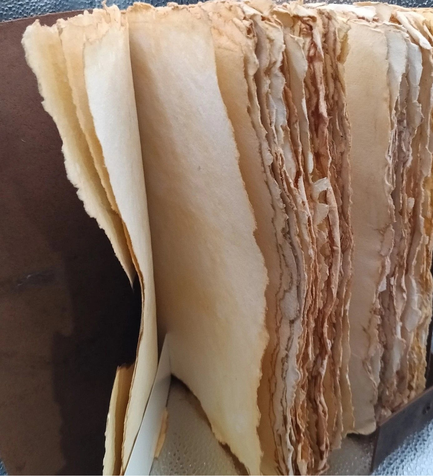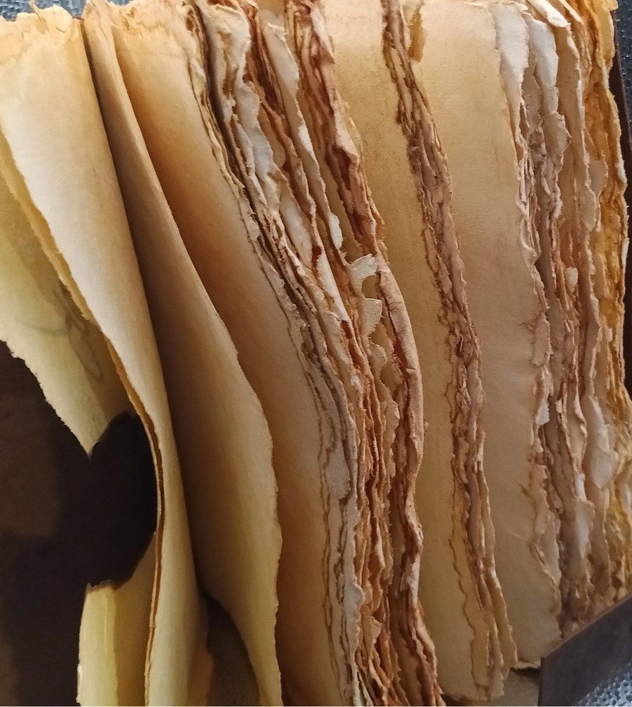 Heavily aged, deckled parchment-style pages