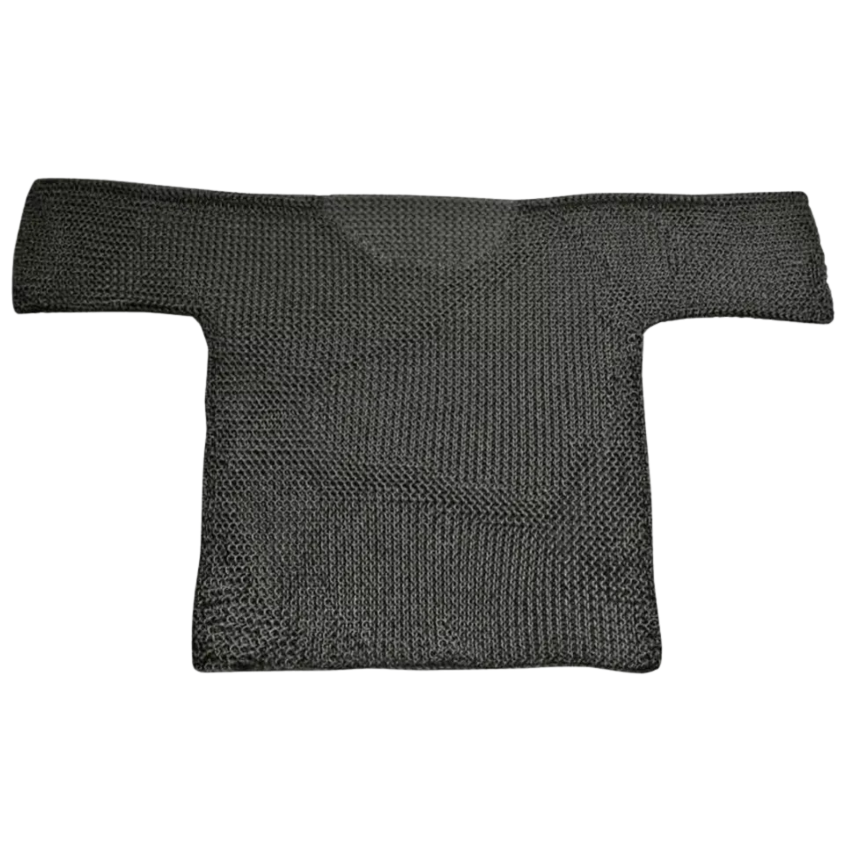 At one point in history, well-made chainmail armor could mean the difference between life and death. While the stakes may not be as high for you at your next reenactment, this shirt will make a difference in terms of authenticity. This mail shirt protects the upper body during battle without restricting movement. It is crafted from 16 gauge mild steel with a black finish. The rings have an inner diameter of 9.5 inches. The rings form a 4-in-1 pattern that consists of four chainmail rings woven through another ring. Butted mail is the most economical construction style of mail and has limited historical precedent. It is fine for general costuming and roleplaying use, but is not recommended for weapons-contact reenactment. Give your costume a boost of authenticity with this Large Black Chainmail Shirt. Features short sleeve construction
