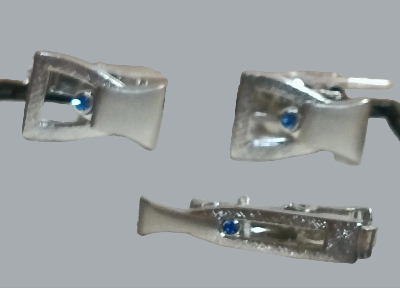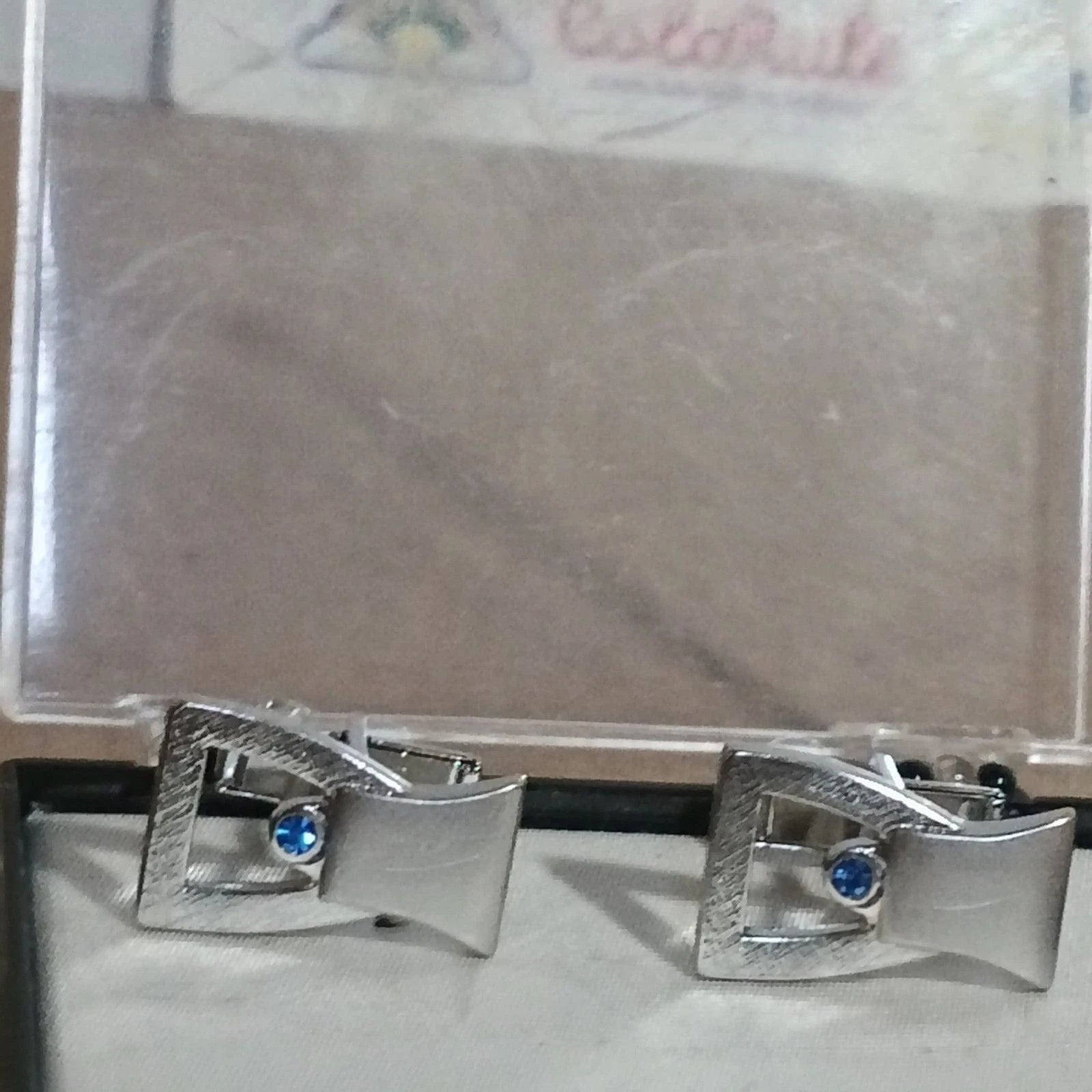 Vintage silver-tone men’s cufflinks and tie clip set with buckle design and small blue rhinestone accents, in presentation box.
