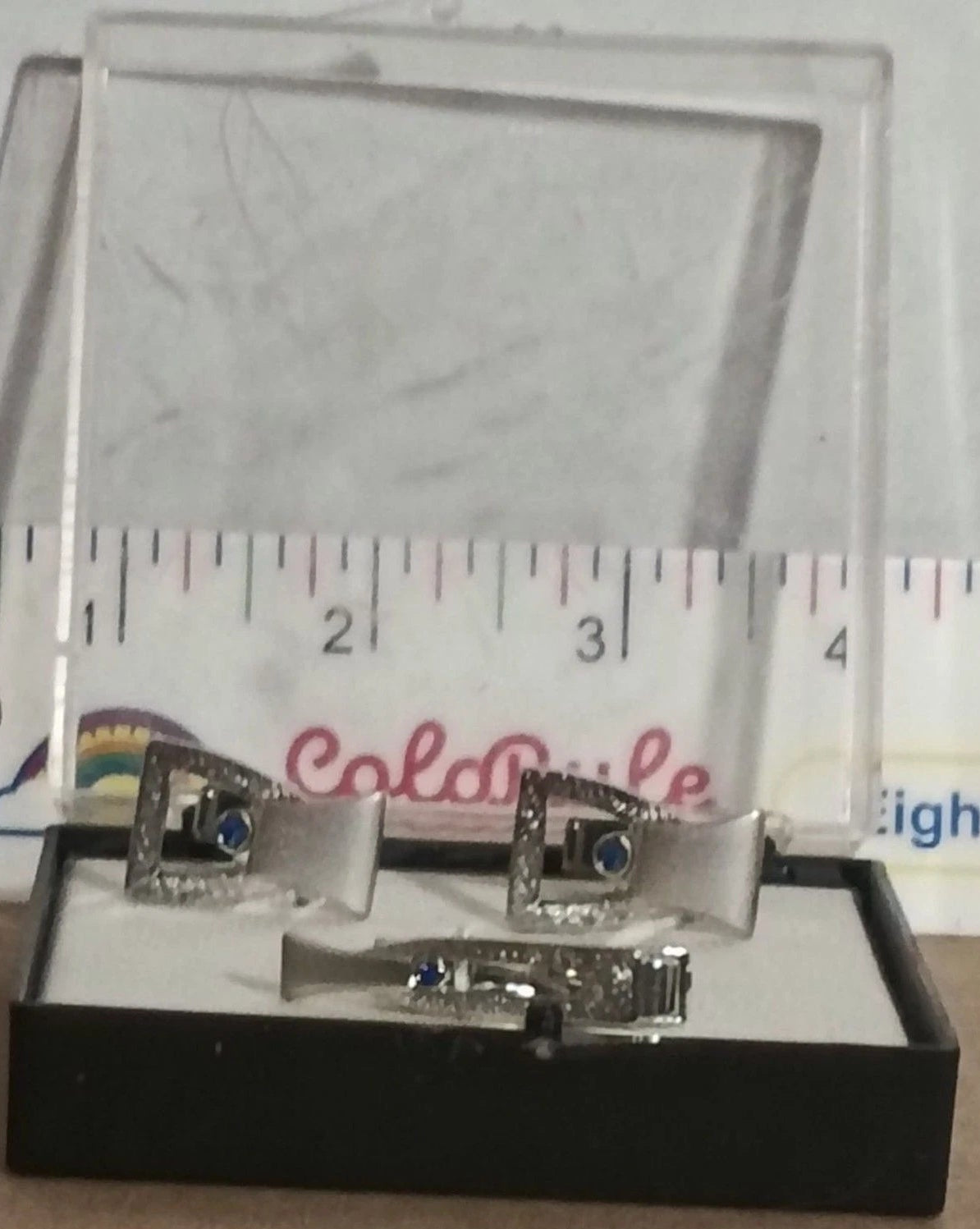 Mens Vintage Silver Tone Buckle Cufflinks Tie Clip Blue Rhinestone