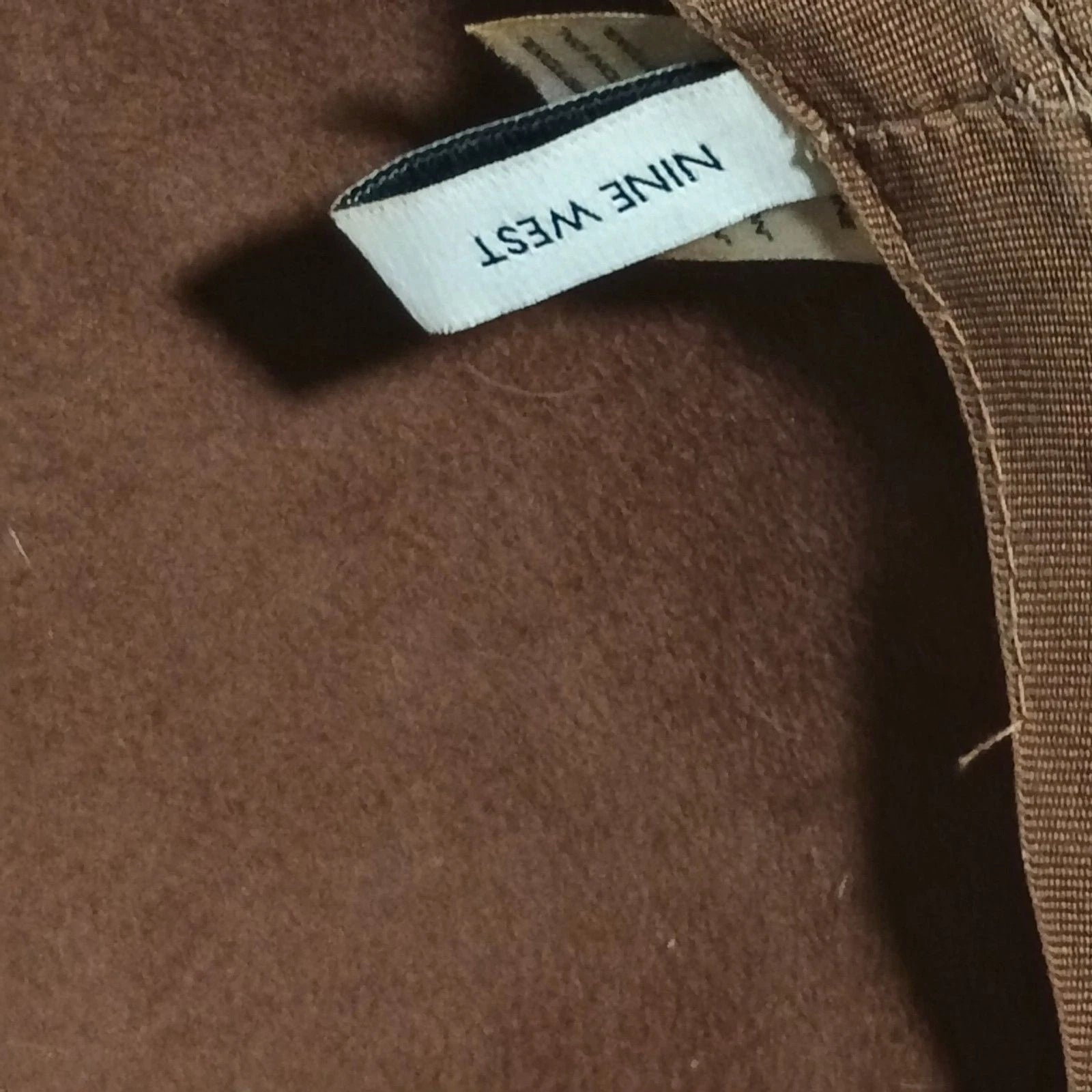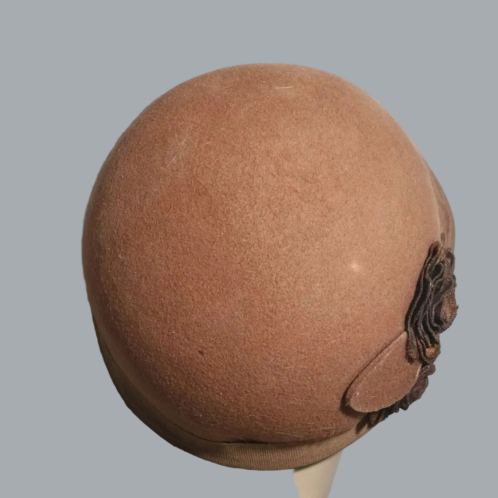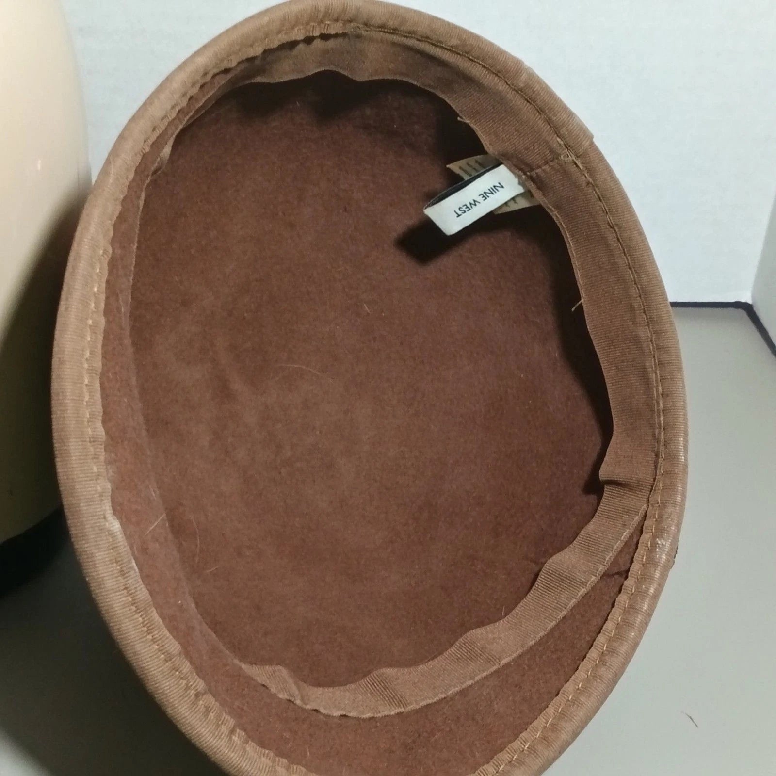 Chic Nine West brown felt cloche hat with grosgrain band and rosette trim—classic 1920s-inspired look for fall/winter.