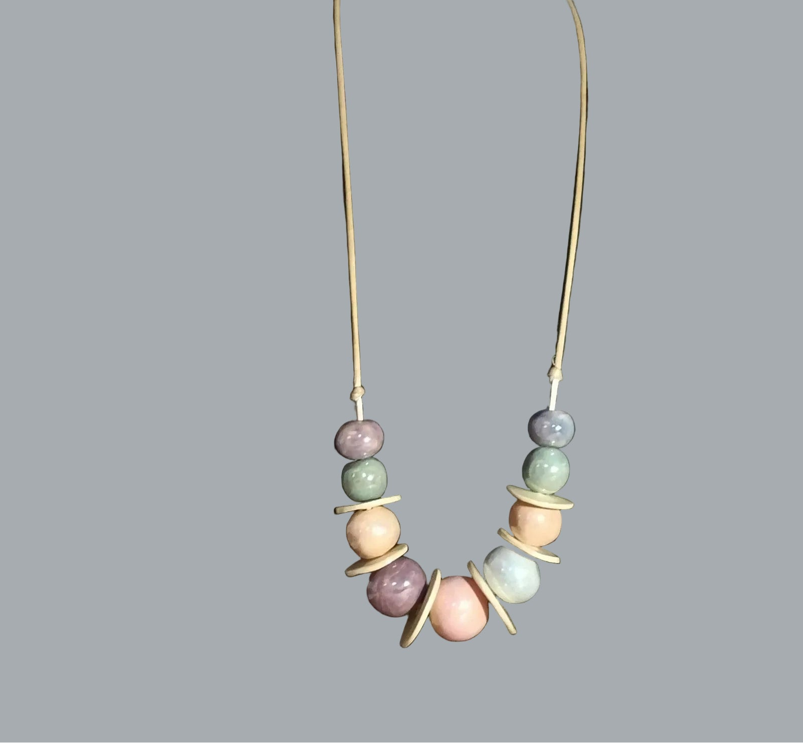 Pastel Glazed Ceramic Bead Necklace Adjustable 24” Tie Cord Statement 5oz