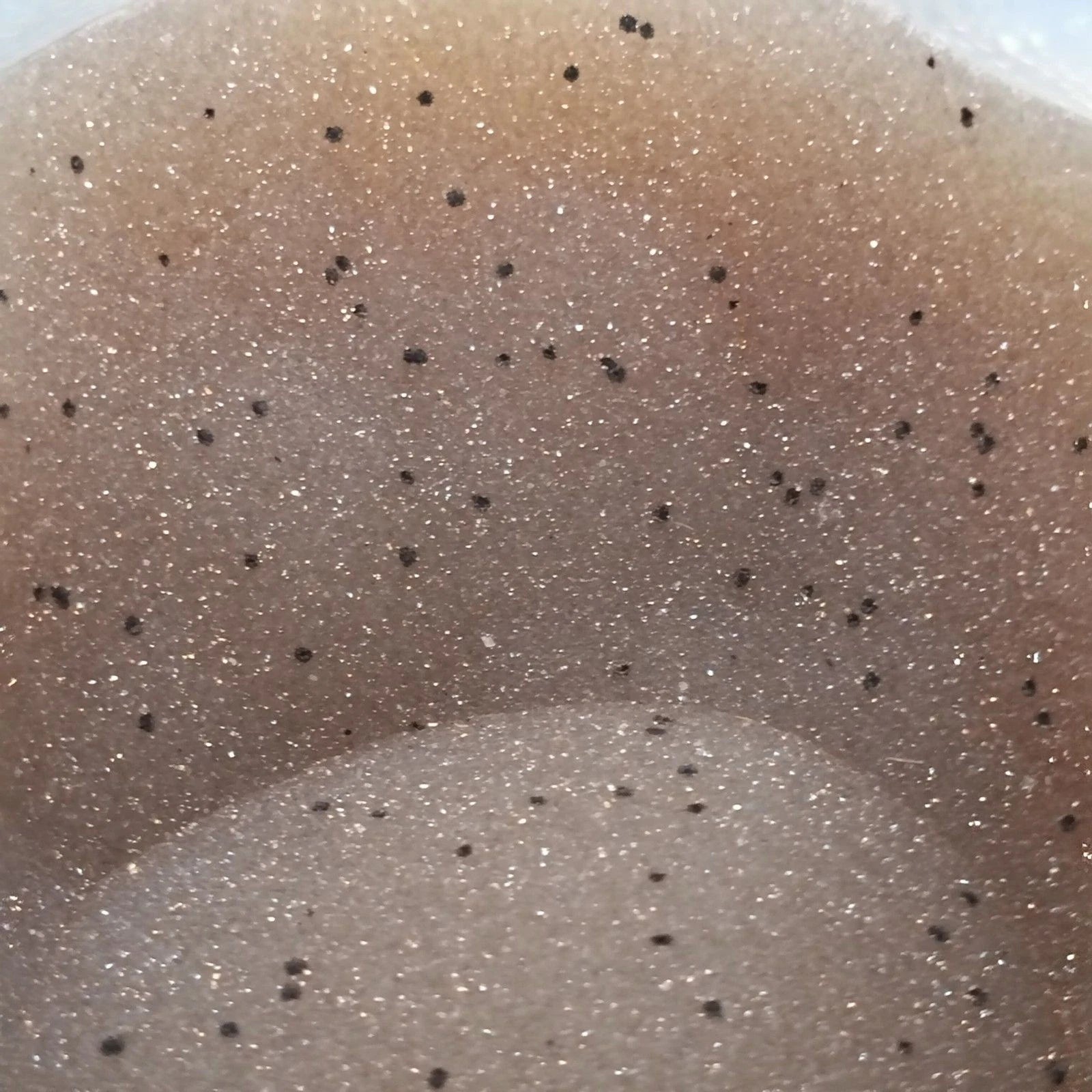 Polished agate / quartz geode display stone featuring a sparkling druzy crystal interior with scattered black mineral inclusions.