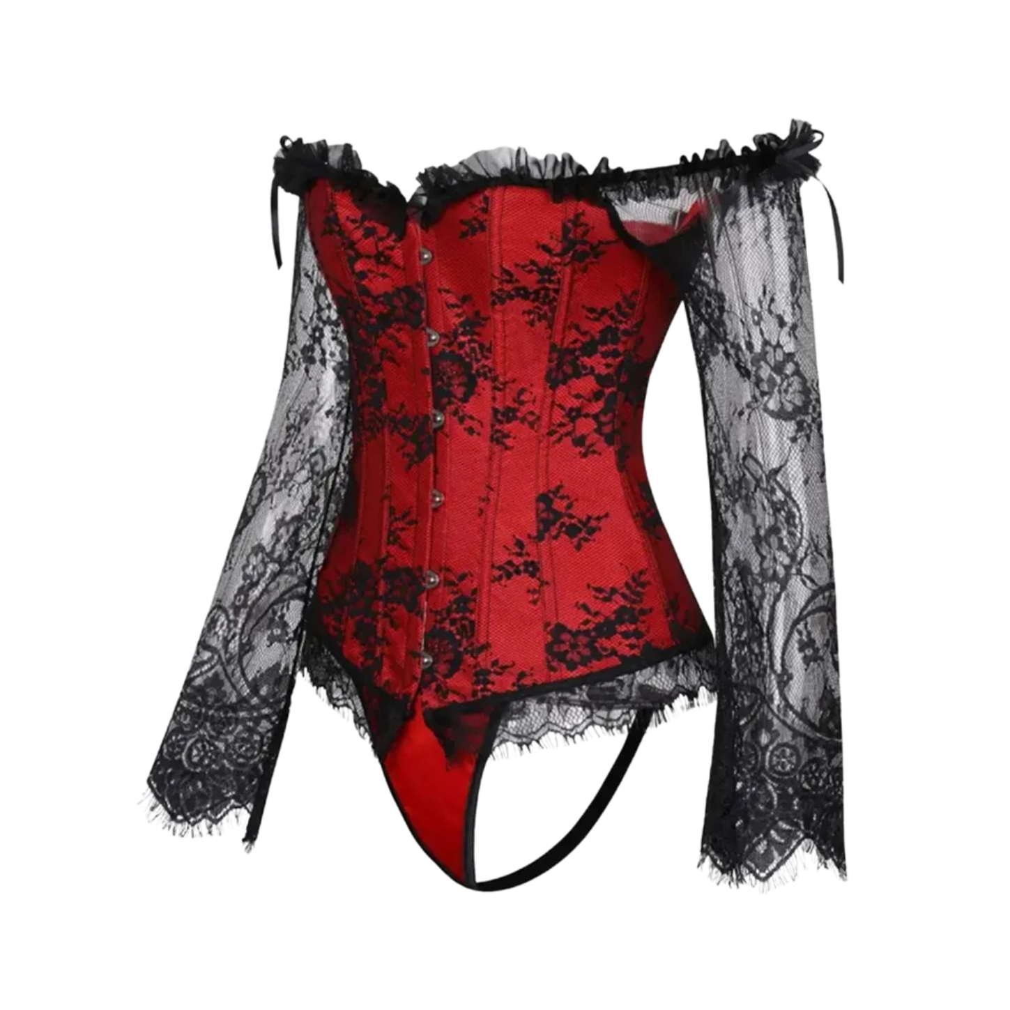 Renaissance Corset Red + Black lace Off Shoulder Lace Court Bustier Top Size 14
