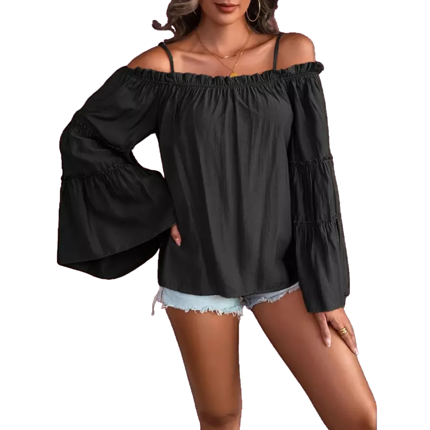 Ruched Spaghetti Strap Blouse Cold Shoulder Blouse Black Size 14