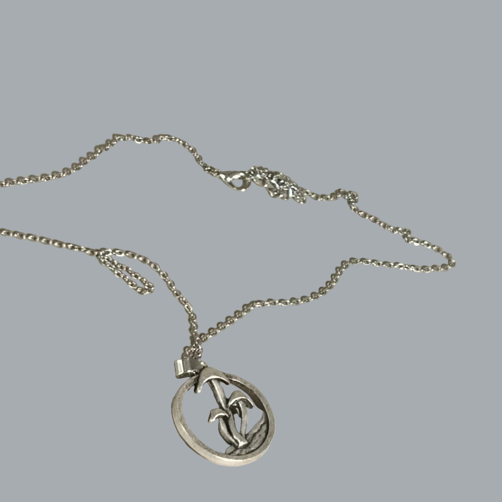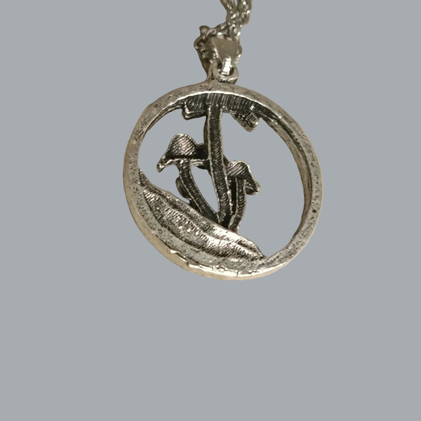 Silver Tone Mushroom Circle Pendant Necklace 19" Chain Nature Woodland