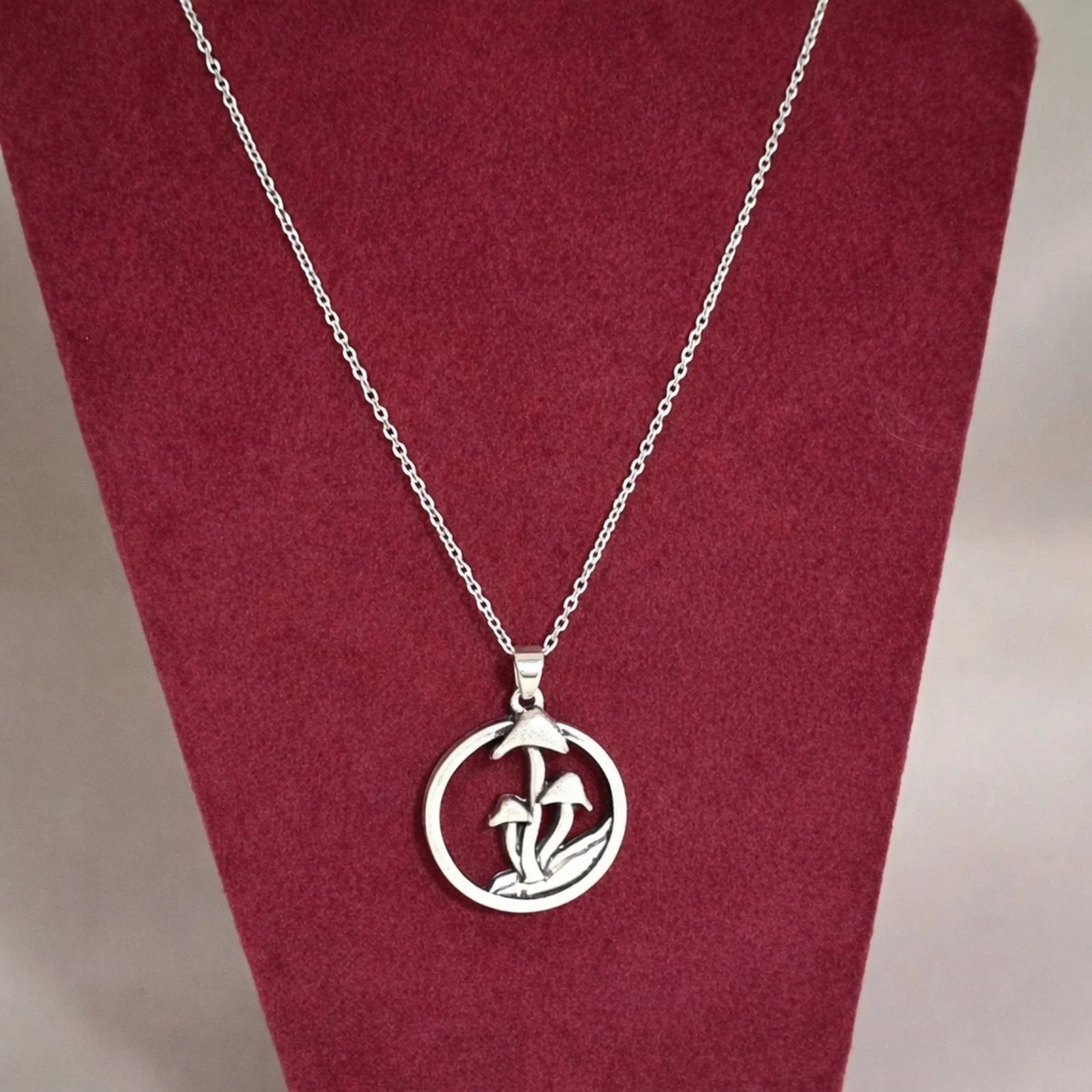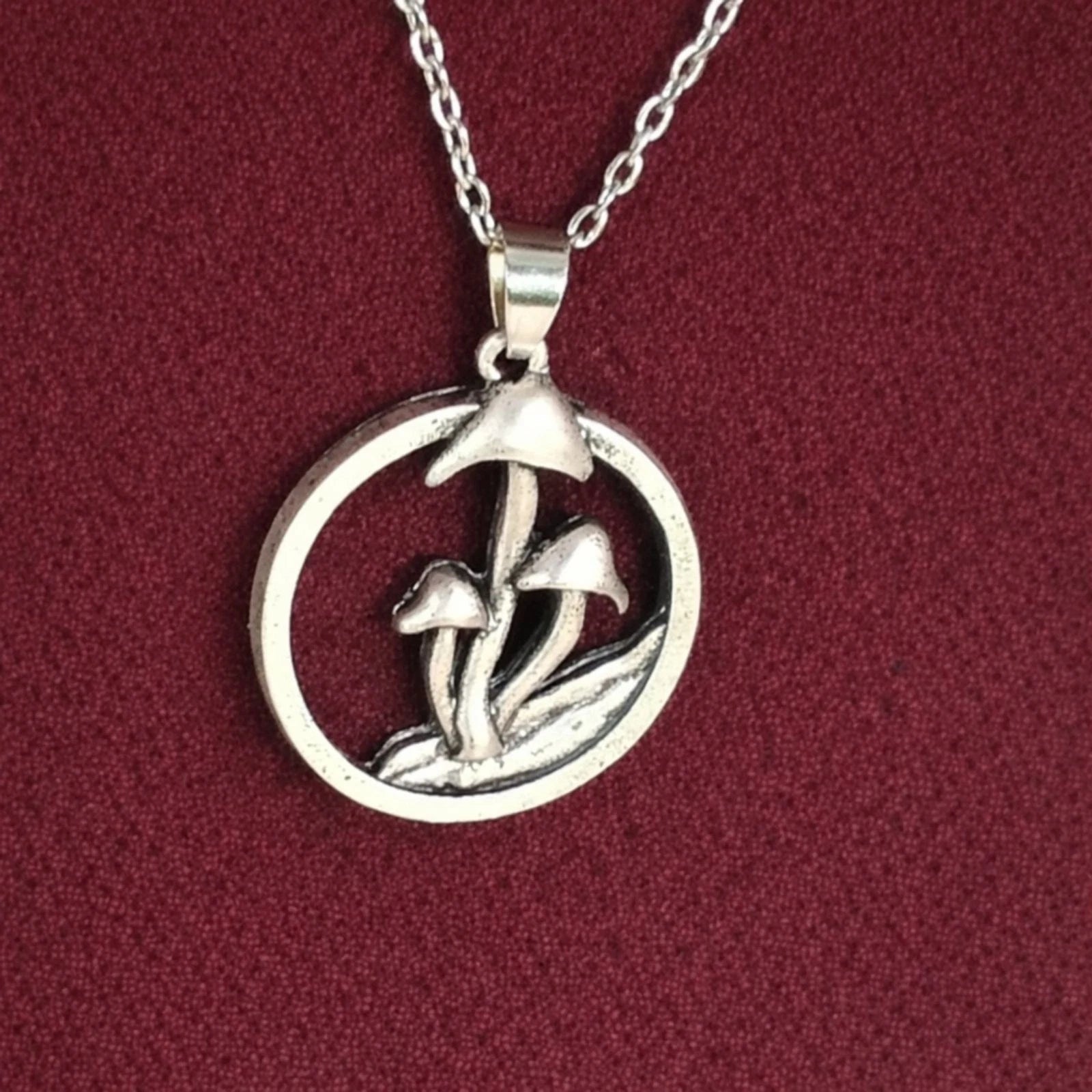 Whimsical woodland mushroom pendant framed in a circle on a delicate 19" chain. Nature-inspired charm perfect for cottagecore and forest lovers. Great for Renfaire!
