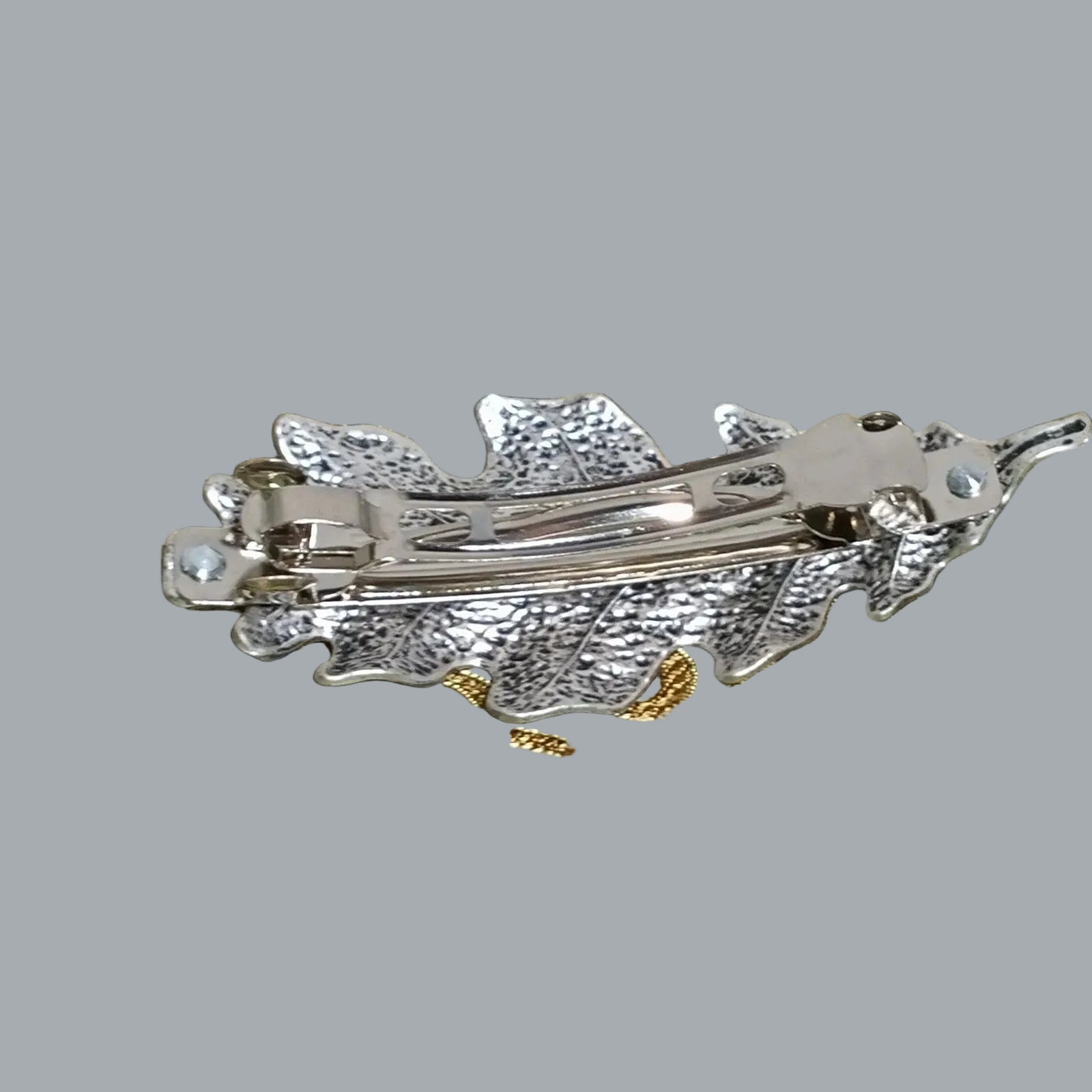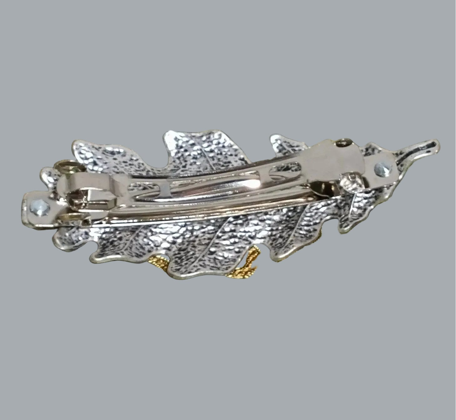 Shimmery silver-tone oak leaf barrette with hammered texture and secure clip back—an easy statement piece for Ren Faire, cottagecore, fall outfits, and everyday hair styling.