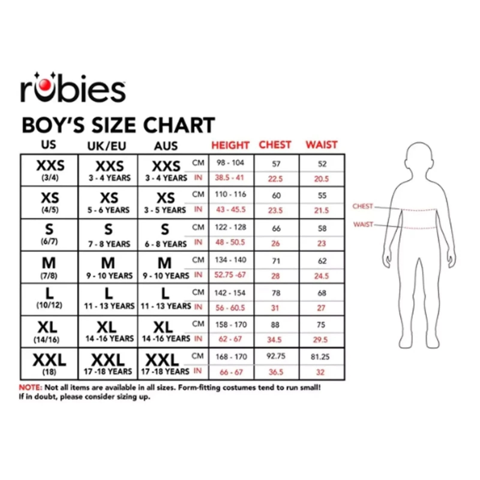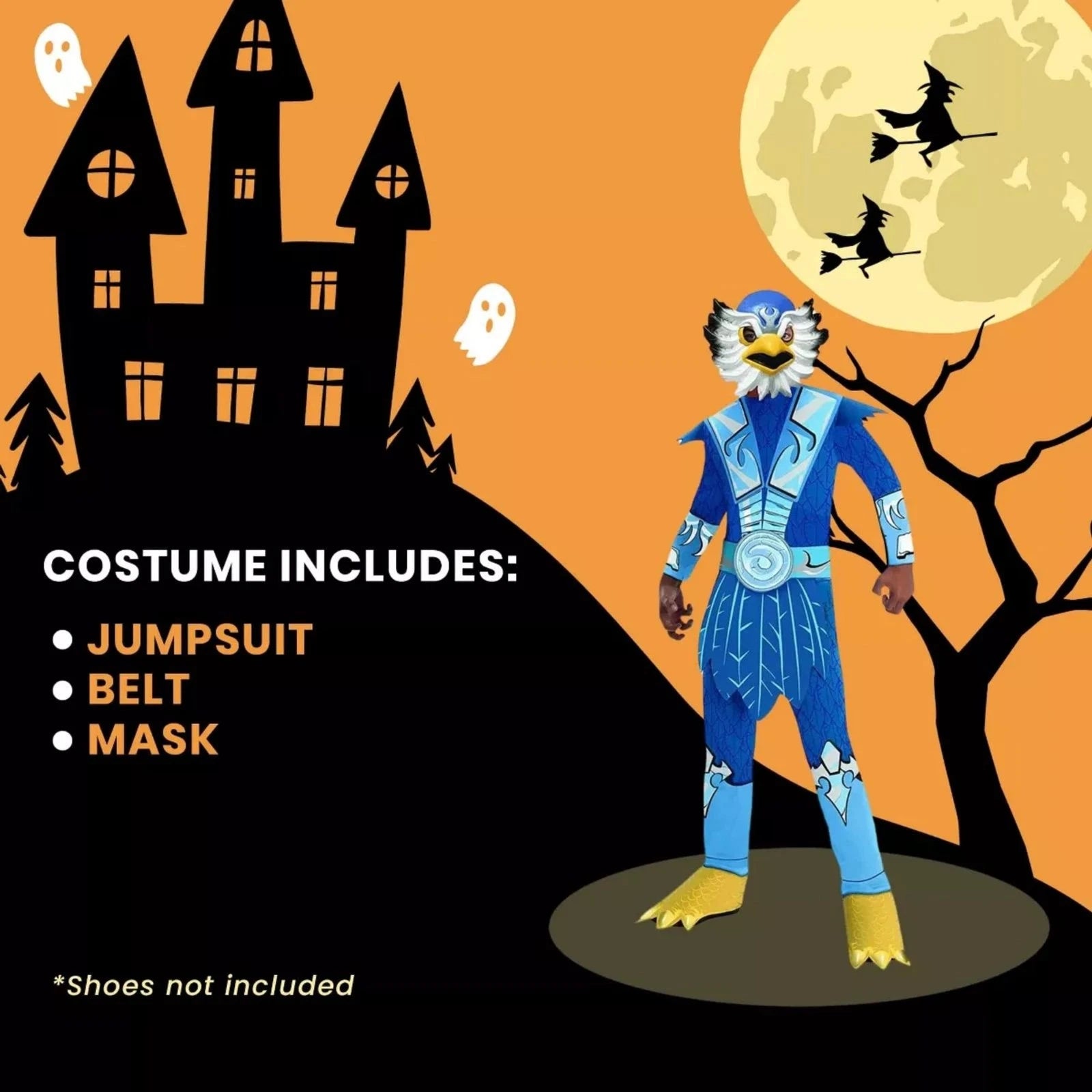 Complete Outfit: Includes jumpsuit with attached boot tops, belt with molded buckle, gauntlets, and character mask.