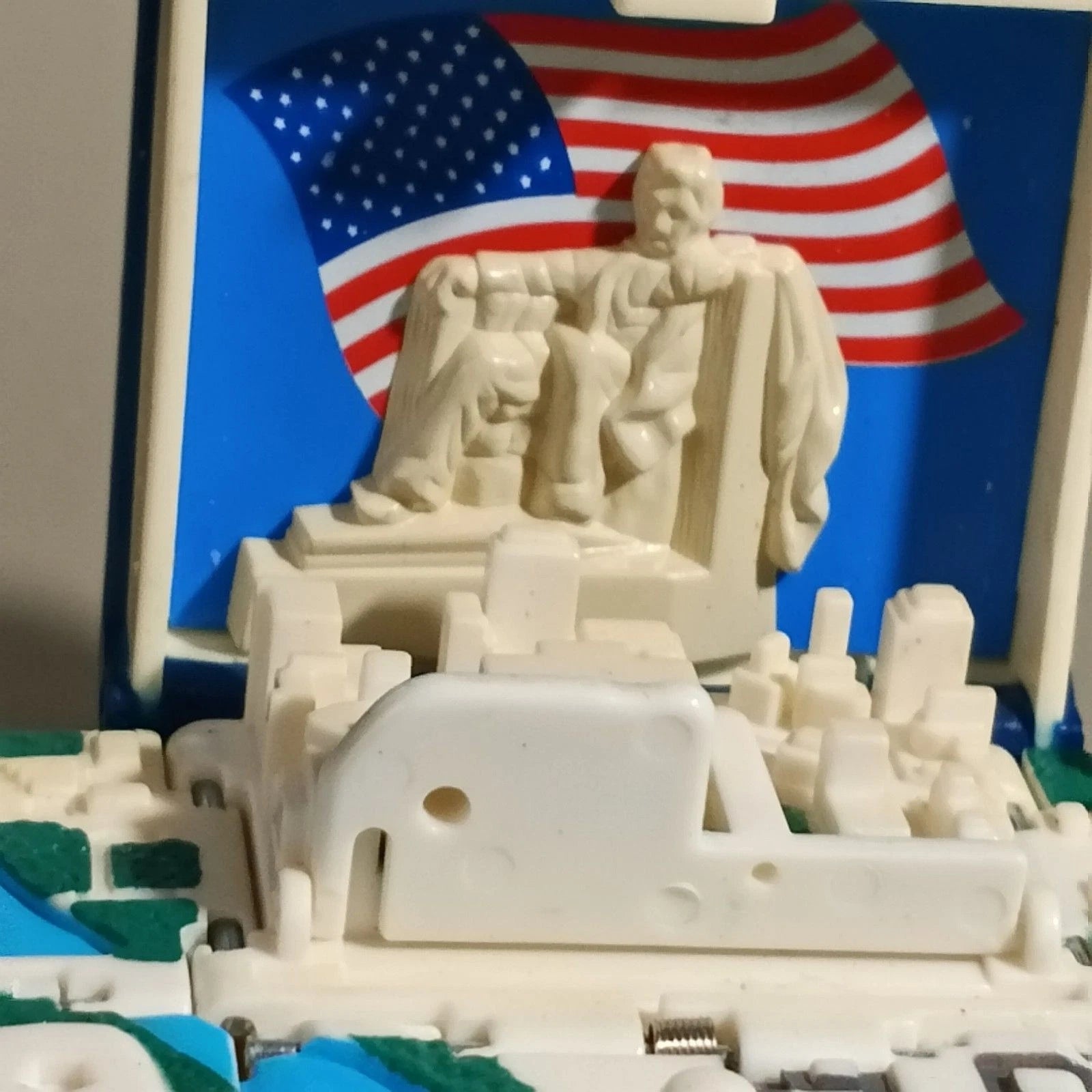 This Smithsonian “Washington D.C. Story” miniature book keychain opens to reveal a detailed 3D scene of the Lincoln Memorial with American flag backdrop. A wonderful souvenir collectible from the mid-1990s gift shop era.