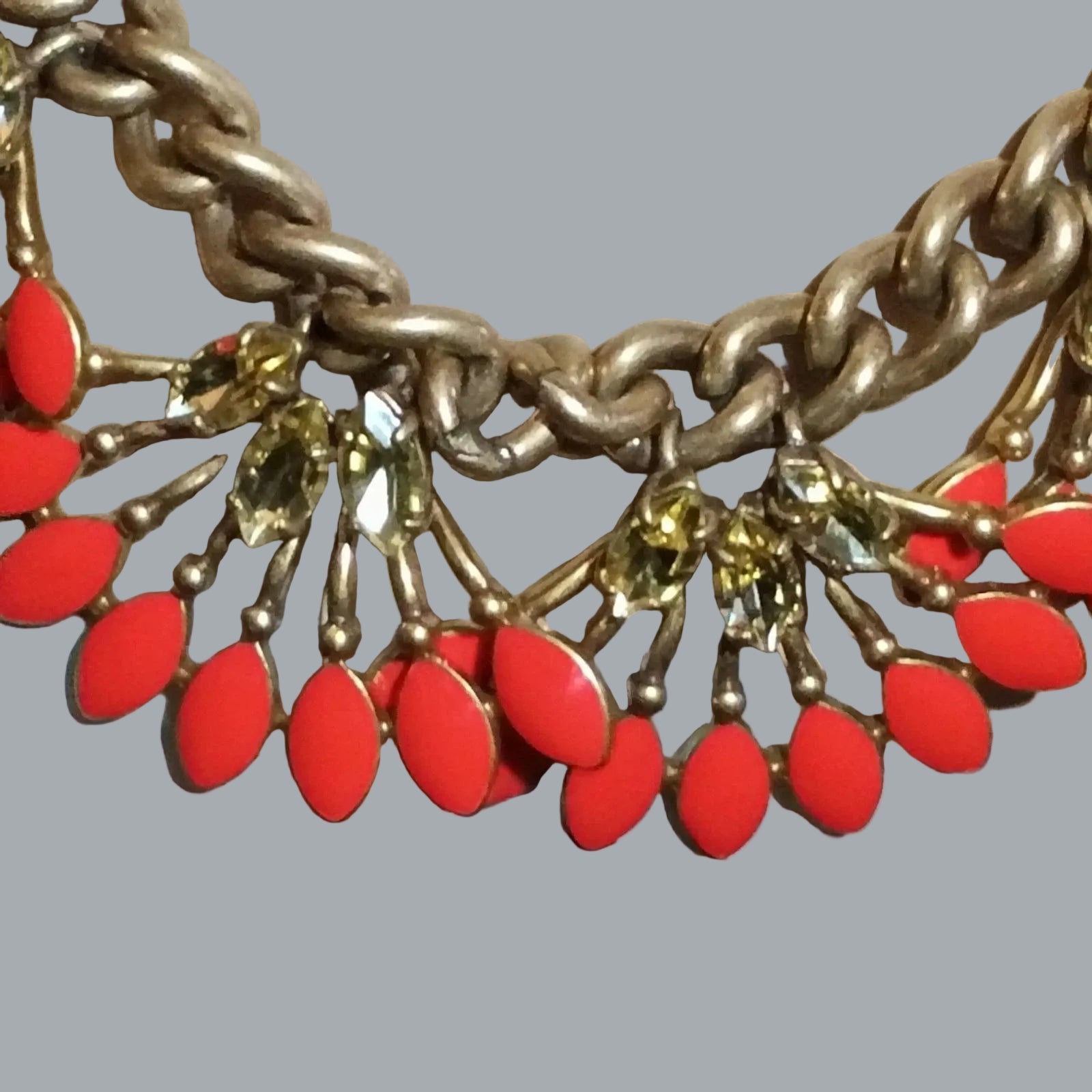 Bold Stella & Dot statement necklace featuring a chunky matte-gold chain with fan-shaped sprays of bright coral red marquise stones and sparkling crystal accents. Adjustable length; perfect pop of color for summer dresses, office outfits, or night-out look.