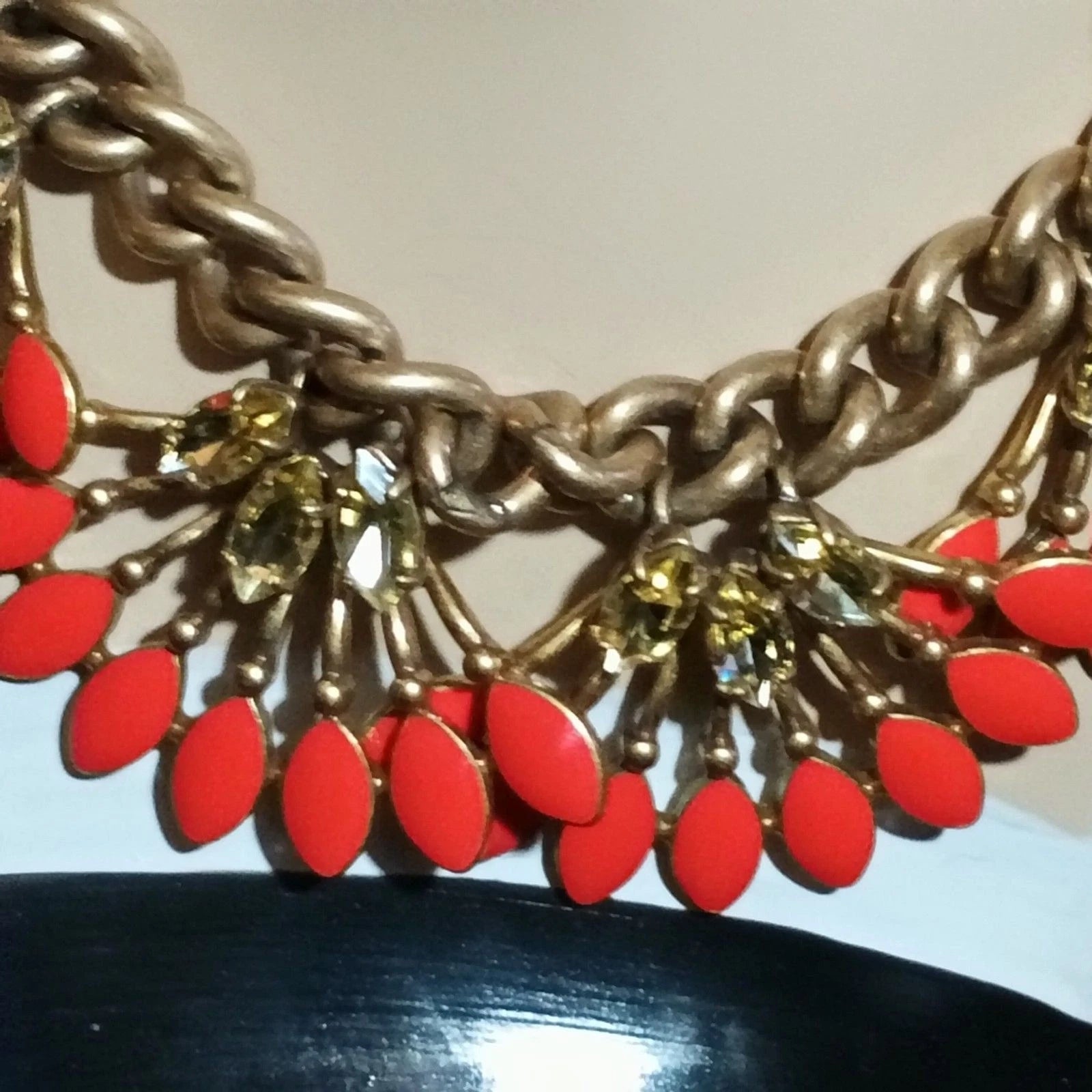 Stella & Dot Gold Tone Coral Red Fan Statement Necklace Chunky Chain