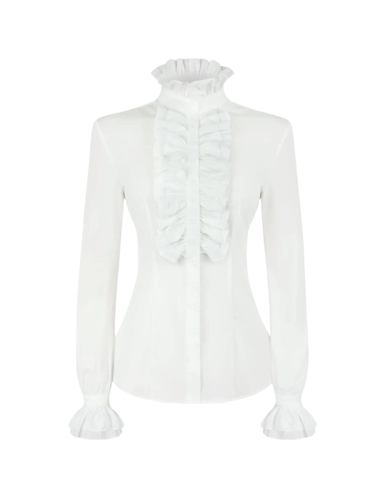 Stand-up collar, ruffle chest and cuff design,casual office work tops