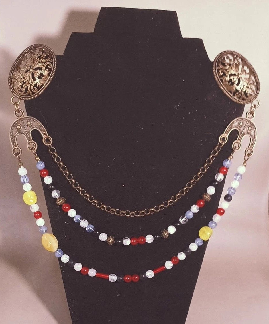 New Viking-style oval brooch set with draped chains and colorful beaded swags—perfect for Ren Faire.