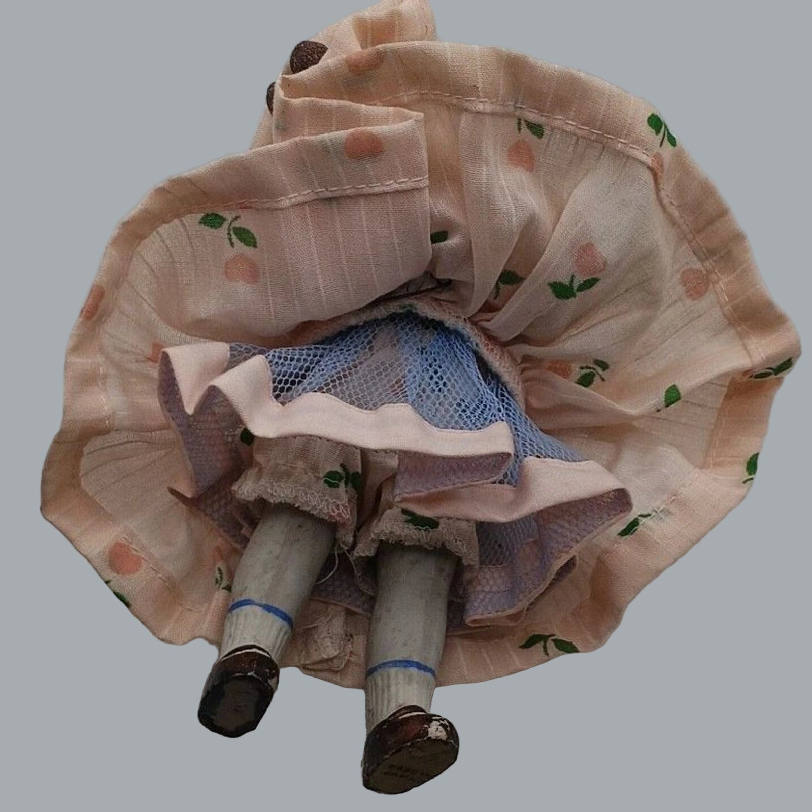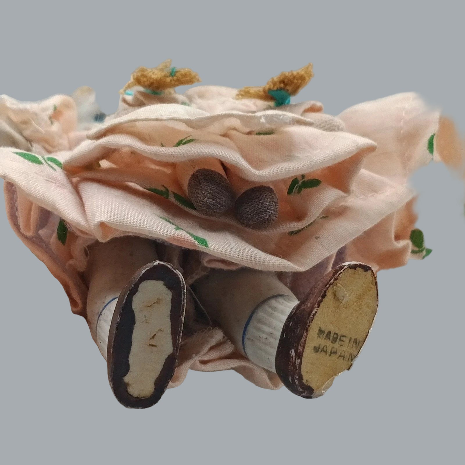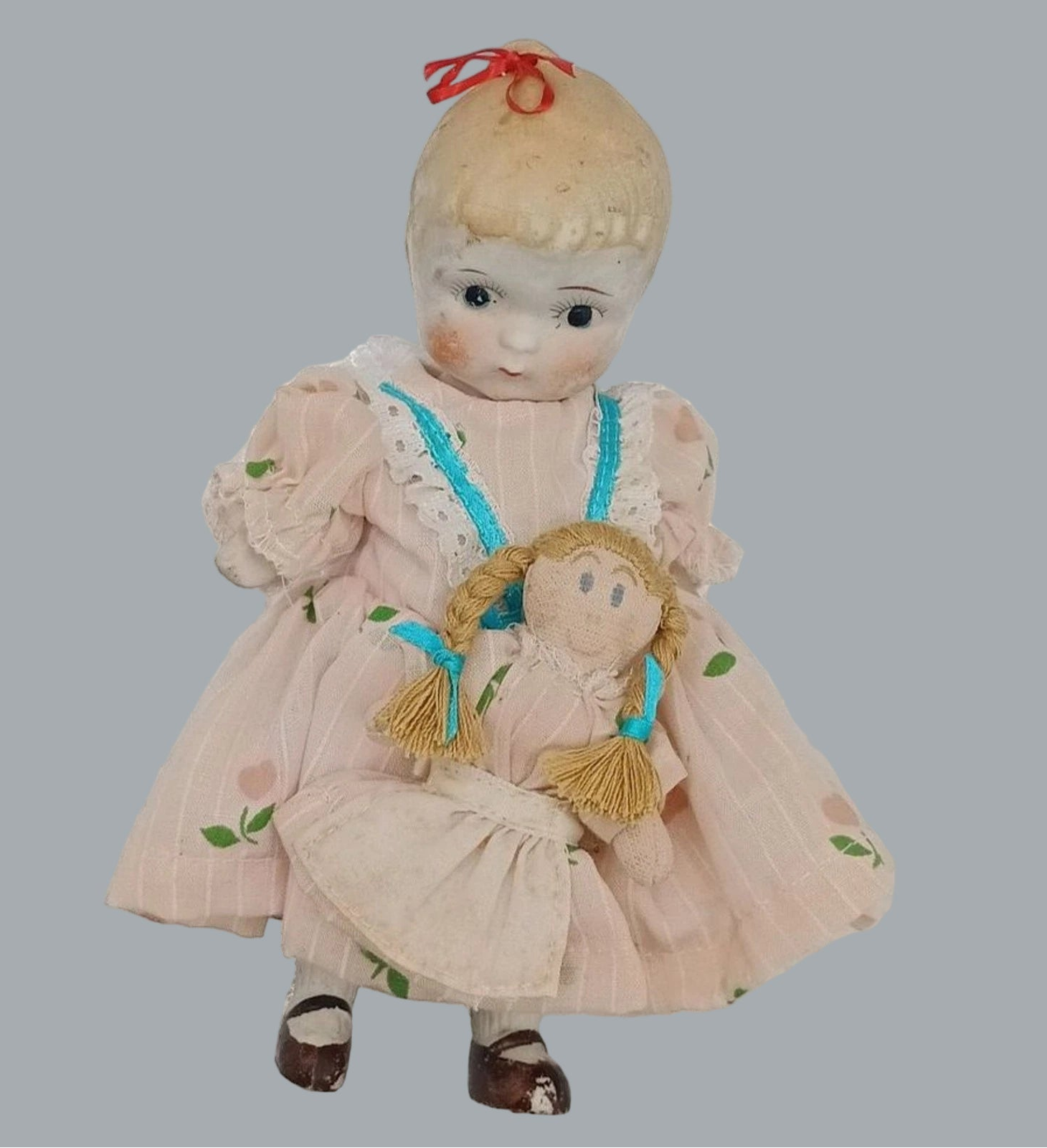 Charming 8-inch all bisque doll marked “Made in Japan.” This vintage collectible features a delicately hand-painted face, molded blond hair, and jointed bisque arms and legs. Dressed in a soft pink period outfit, she reflects the fine craftsmanship of early 20th-century Japanese bisque dollmaking.