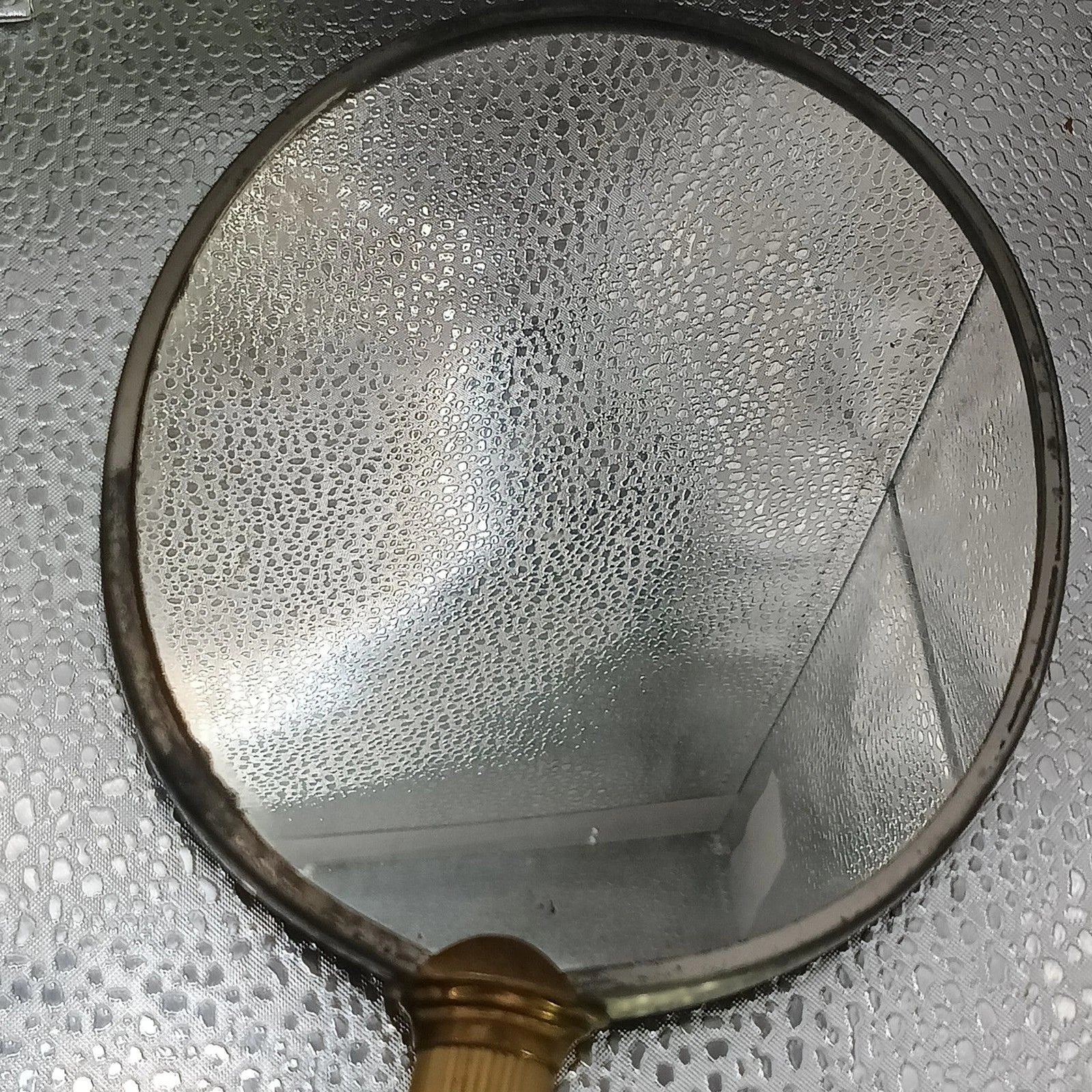 Elegant vintage vanity set with matching hand mirror and brush. Gold-tone ribbed handles, cream tops with floral medallion and aged patina. Bristles intact. Mirror back has a small chip in the finish and general wear—see photos. Lovely shabby chic dresser display.