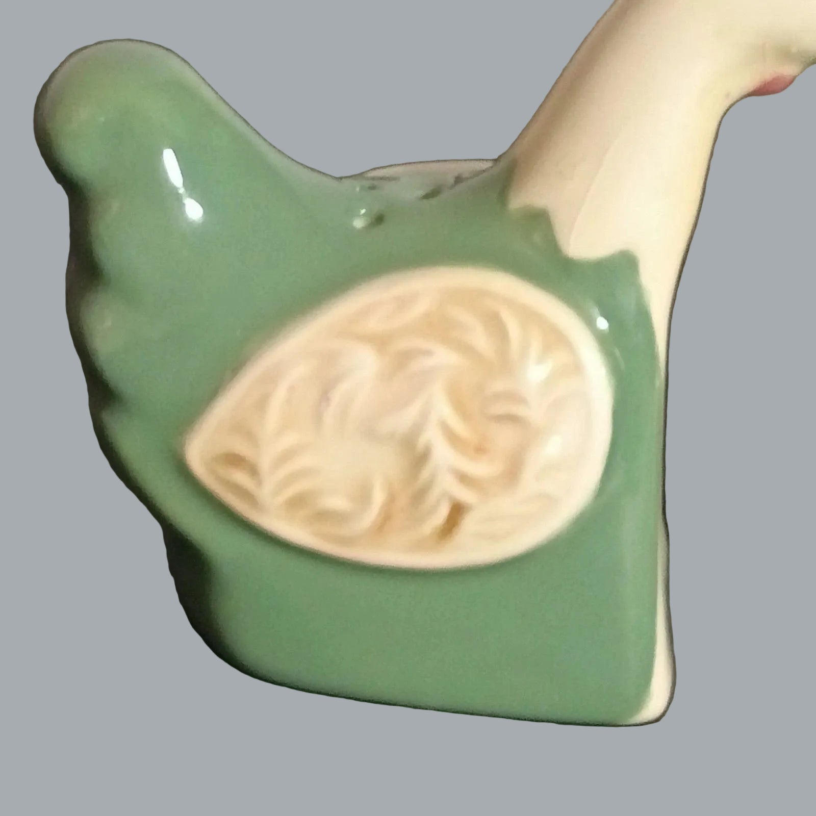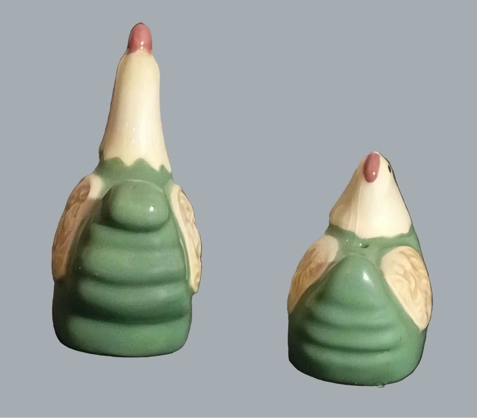 Adorable vintage ceramic snuggling chicken salt & pepper shakers in green and cream, a sweet matched pair with both plastic stoppers—perfect farmhouse or retro kitchen décor.