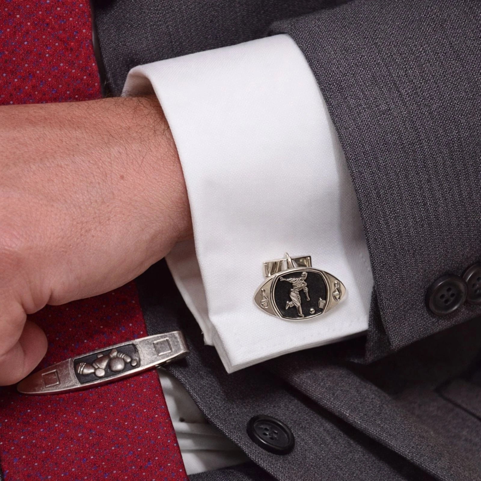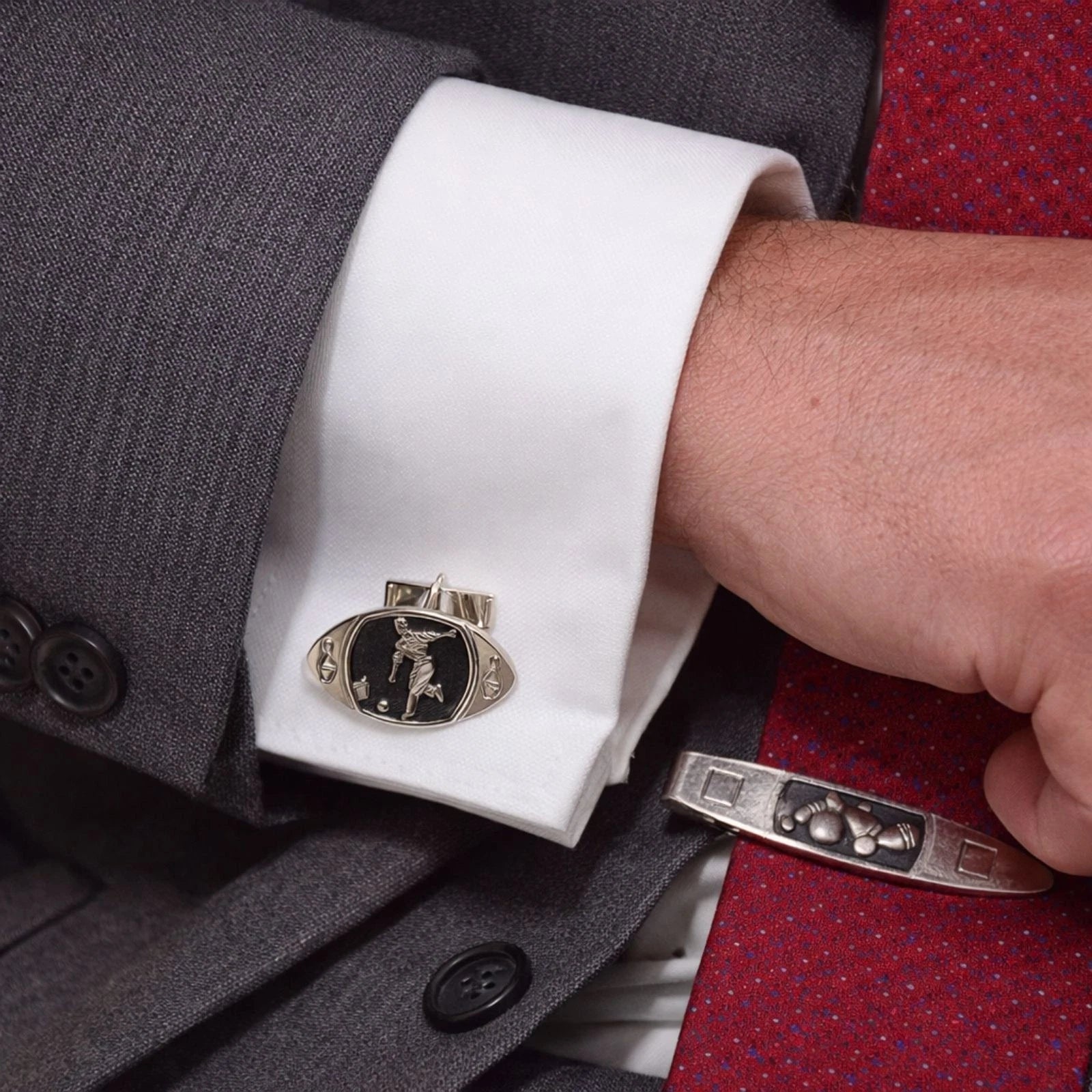 Bowling theme: bowler figure cufflinks + pins/ball tie bar