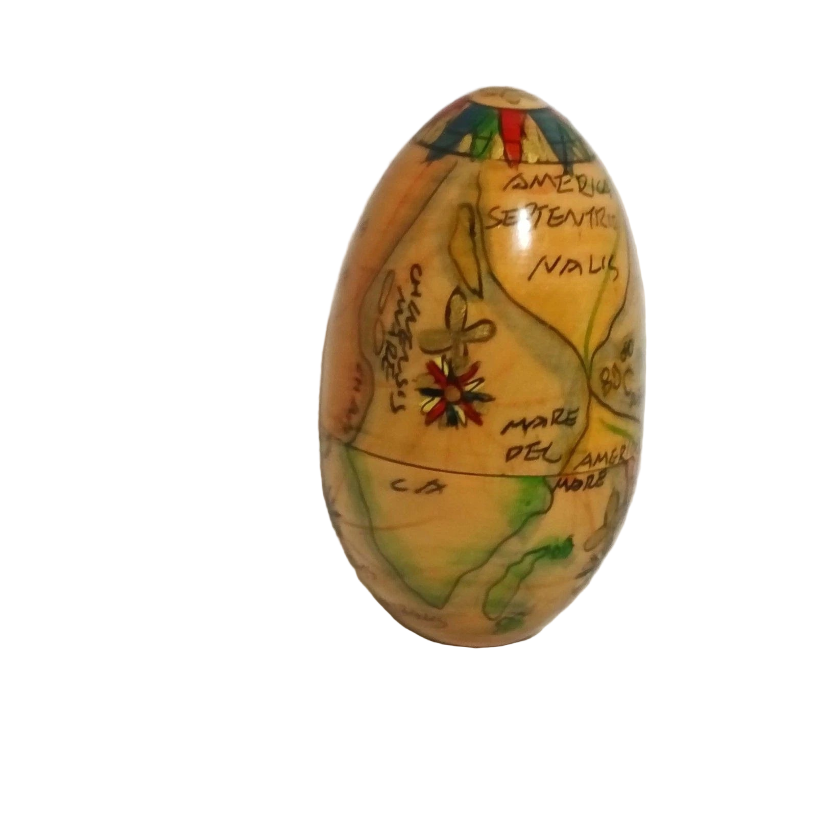 Charming wooden nesting egg set hand painted with an old-world style map motif. Largest egg about 4" high x 2" wide, five hollow pieces stack neatly together. Warm glossy finish creates a unique bookshelf accent or travel-themed gift.