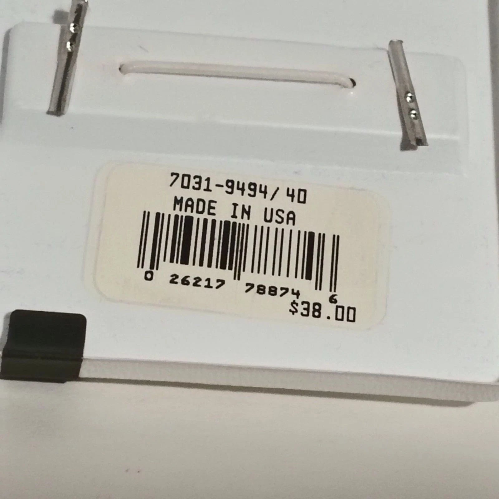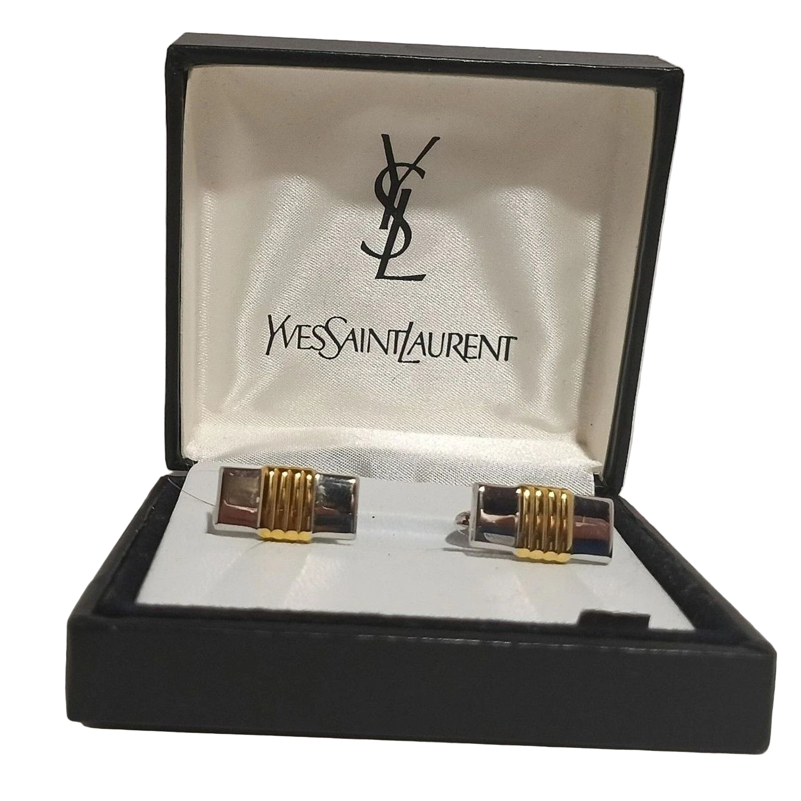 Sleek Yves Saint Laurent men’s cufflinks in original YSL logo box from Macy’s. Classic silver-tone bars with ribbed gold-tone center detail, perfect for business, weddings, or collectors of designer menswear. Pre-owned/old stock; box shows light sticker wear, cufflinks look excellent.